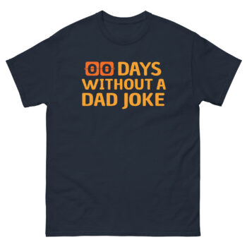 The bold, bright orange highlights the words “DAD JOKE,” making them pop against the clean shirt background. Meanwhile, the “00” counter proudly declares a perfect record of joke-telling consistency. This visual style, reminiscent of a workplace safety sign, adds to the comedic effect. Therefore, it’s not just a phrase; it’s a statement that everyone in the family will understand and appreciate. It’s the definitive sarcastic joke tee for fathers and husbands who own their humorous role.