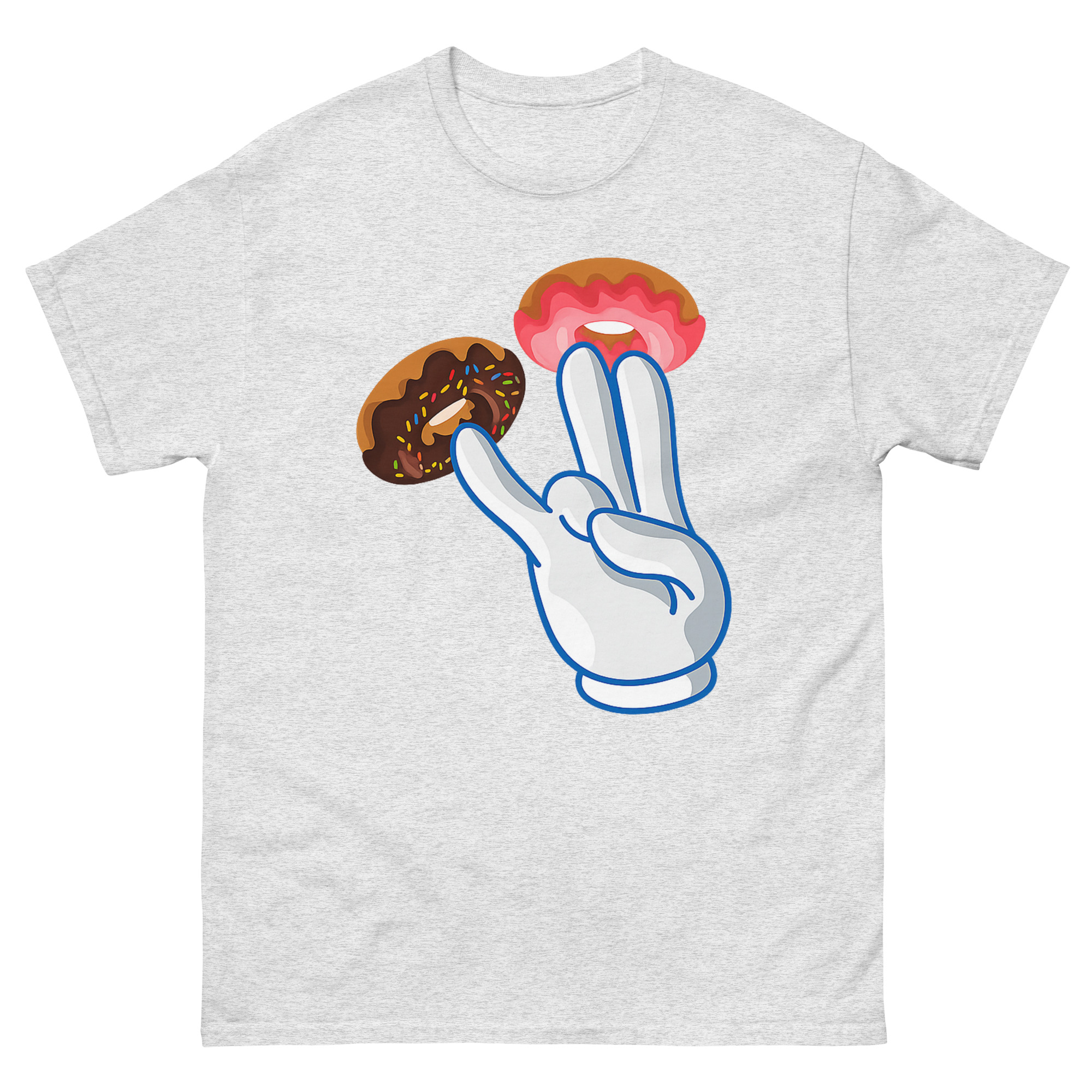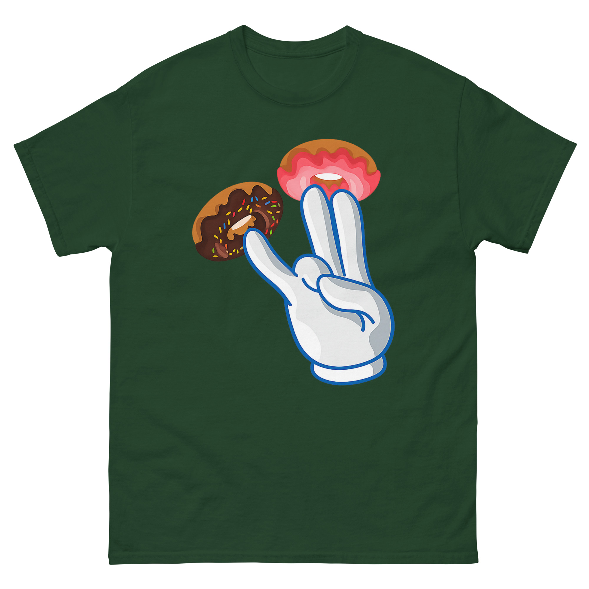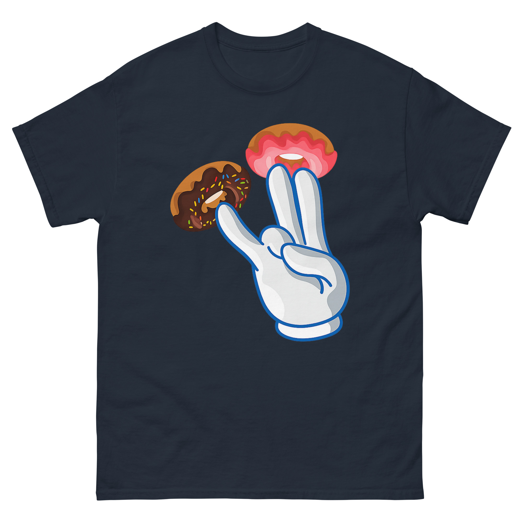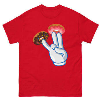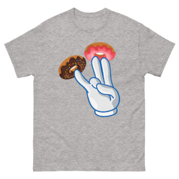 Instead of an obvious design, we used a bright white cartoon glove, a nod to classic animation, adorned with donuts. Two fingers get vibrant pink strawberry frosting donuts, while a third gets a dark chocolate sprinkle donut. The result is a high-contrast, pop-art style that looks like a fun bakery joke from a distance. However, the double entendre is quickly clear, making it a perfect piece of street culture parody. This naughty cartoon hand gesture shirt is for anyone with a bold, offensive humor style who loves seeing the reaction when someone gets the funny donut pun. It’s a standout piece for parties, bars, or as a novelty graphic tee for someone who doesn’t take themselves too seriously.