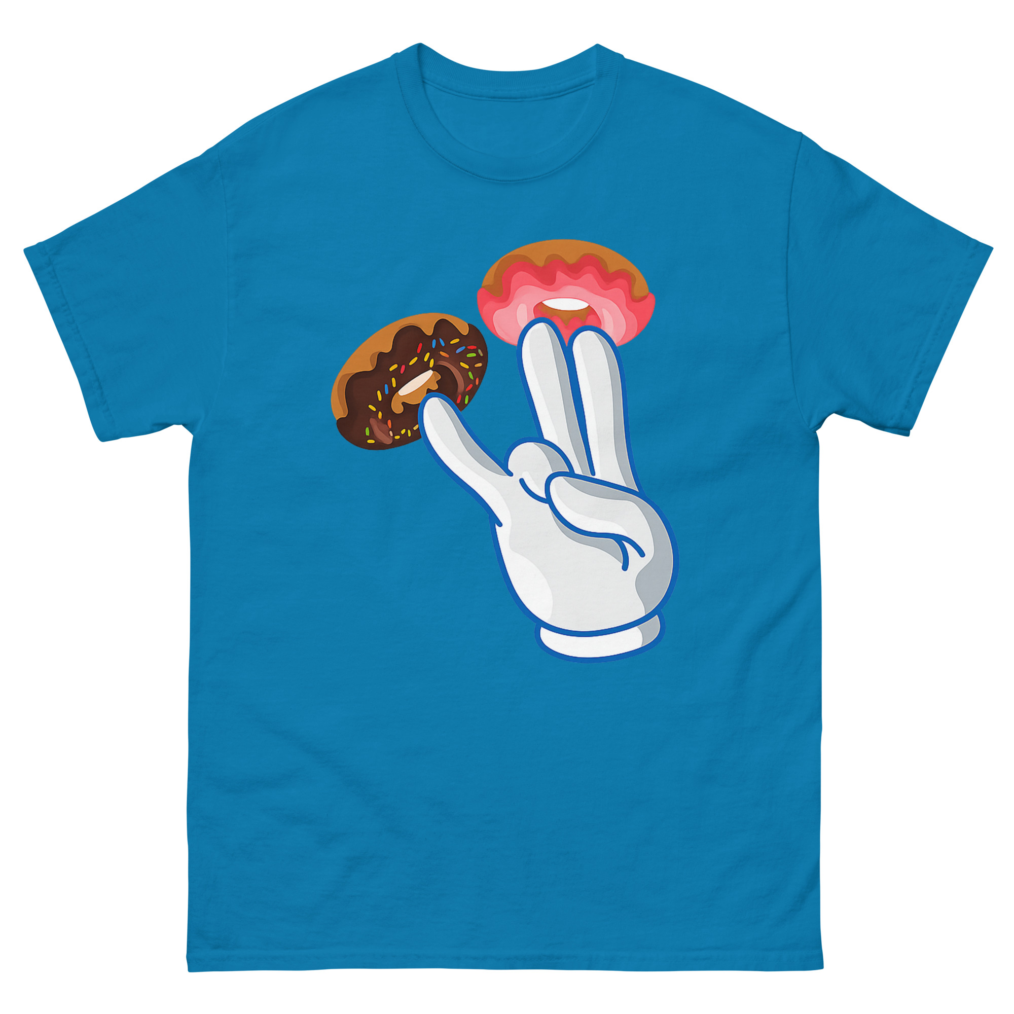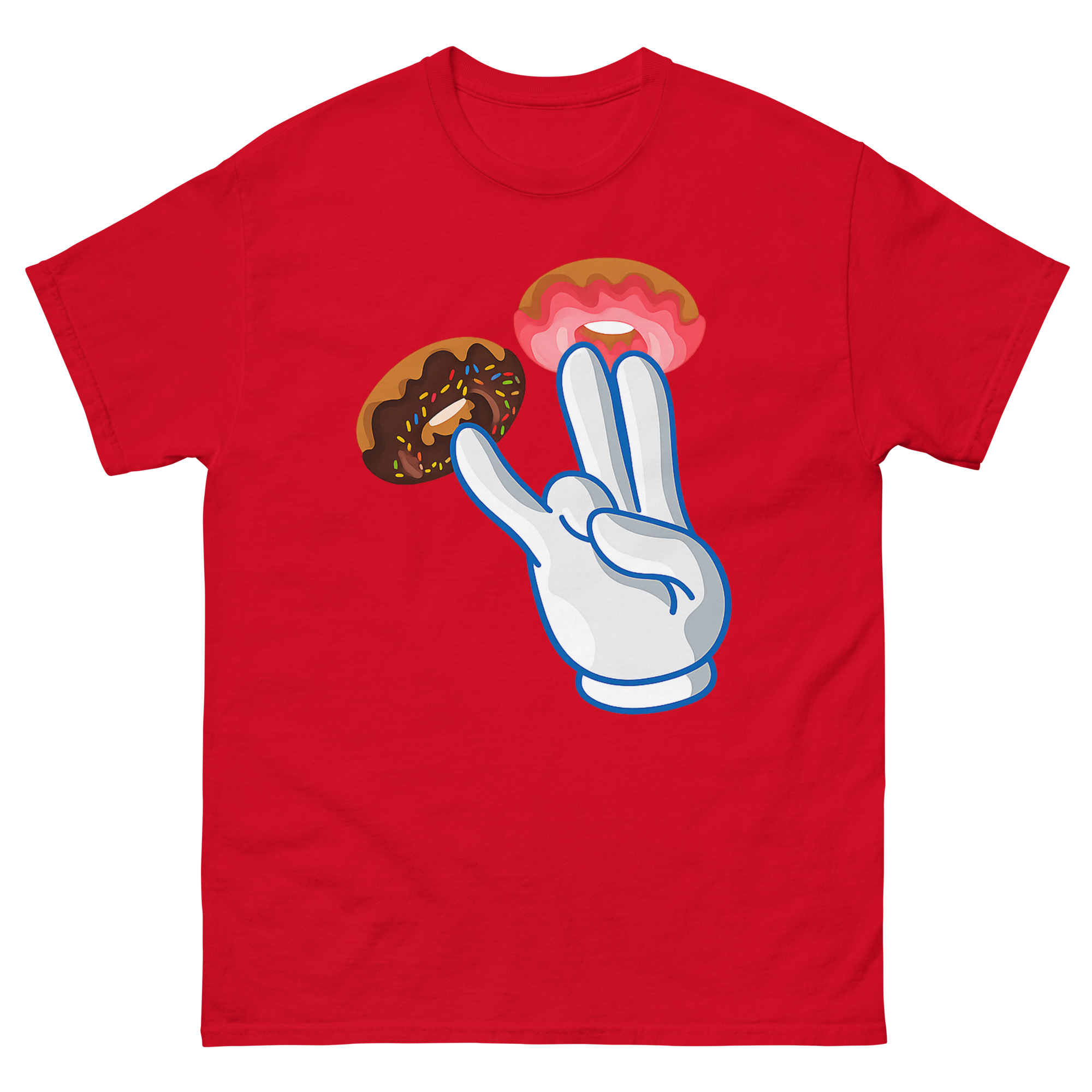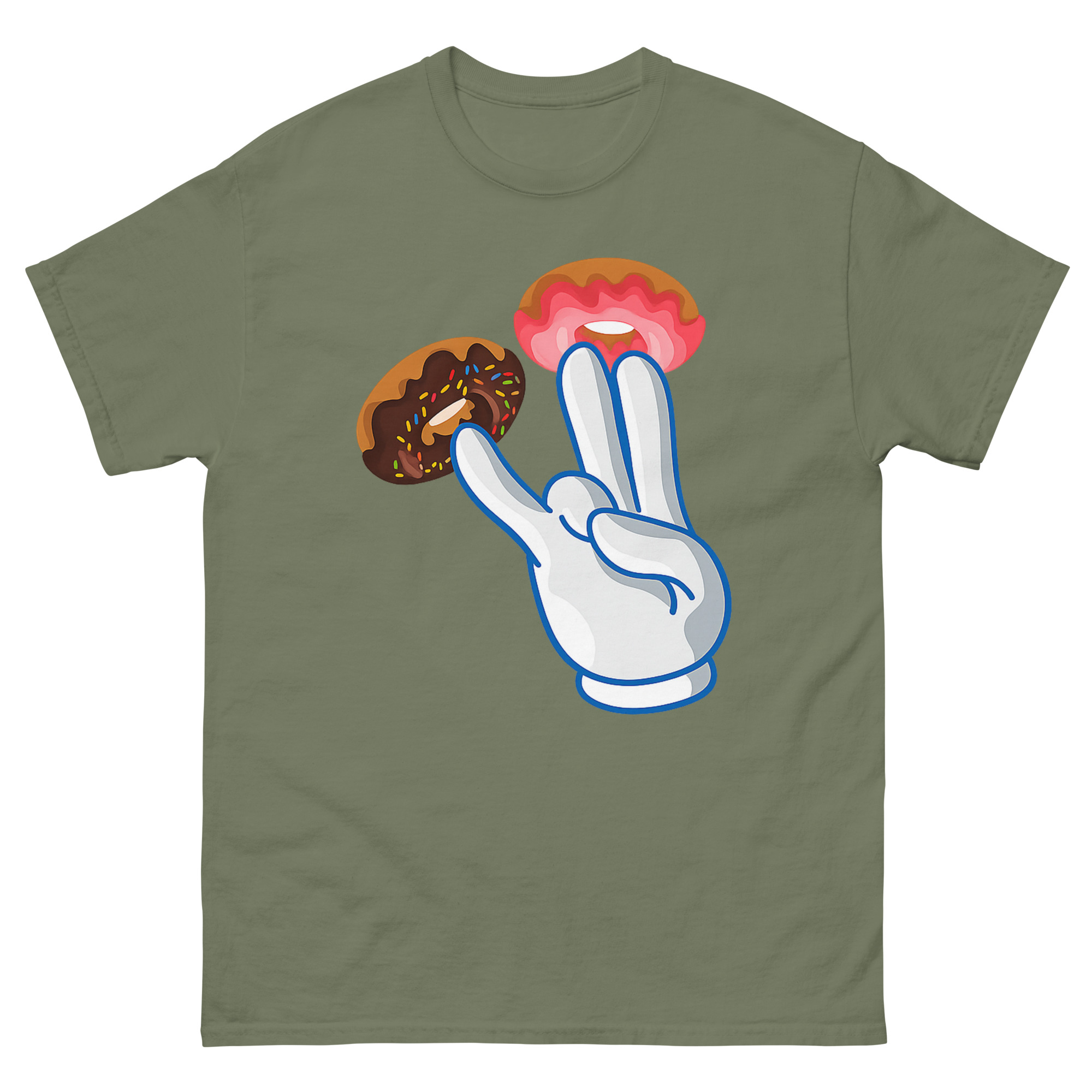 Instead of an obvious design, we used a bright white cartoon glove, a nod to classic animation, adorned with donuts. Two fingers get vibrant pink strawberry frosting donuts, while a third gets a dark chocolate sprinkle donut. The result is a high-contrast, pop-art style that looks like a fun bakery joke from a distance. However, the double entendre is quickly clear, making it a perfect piece of street culture parody. This naughty cartoon hand gesture shirt is for anyone with a bold, offensive humor style who loves seeing the reaction when someone gets the funny donut pun. It’s a standout piece for parties, bars, or as a novelty graphic tee for someone who doesn’t take themselves too seriously.