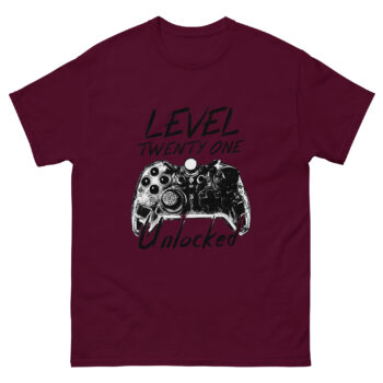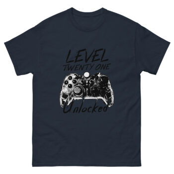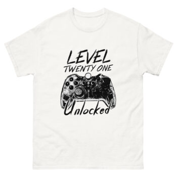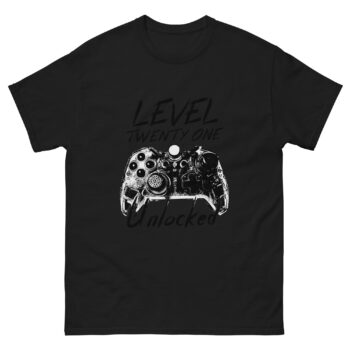 This t-shirt design is perfect for a 21st birthday gift with a gaming theme. It features a bold black gaming controller graphic with the text “Level Twenty One Unlocked”, symbolizing leveling up in life. A fun, casual gift idea for gamers turning 21.