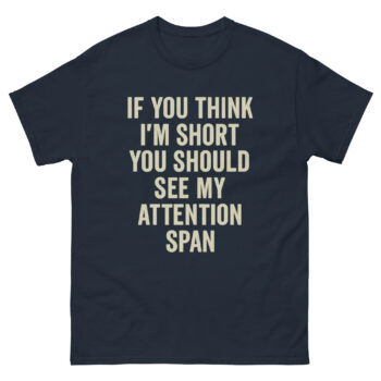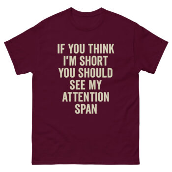For many with ADHD, the phrase “short attention span” isn’t just a term; it’s a daily reality. This funny short attention span t shirt cleverly plays on this concept. The design reads: “IF YOU THINK I’M SHORT YOU SHOULD SEE MY ATTENTION SPAN.” Instead of feeling frustrated, this shirt encourages you to own your narrative with confidence and humor.
