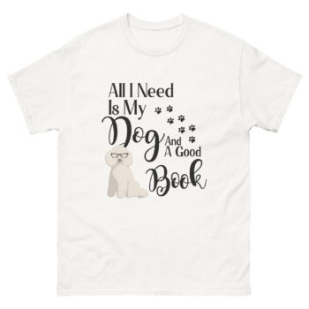 Firstly, the design captivates with its intelligent charm. It features an adorable, bespectacled white dog, sitting patiently as if waiting for you to turn the next page. This clever imagery instantly signals that this isn’t just another generic pet shirt. The text, “All I Need Is My Dog And A Good Book,” is typeset with purpose. Importantly, the words “Dog” and “Book” shine in larger, elegant cursive, highlighting the two pillars of this perfect equation. The scattered paw prints add a final touch of playful authenticity.