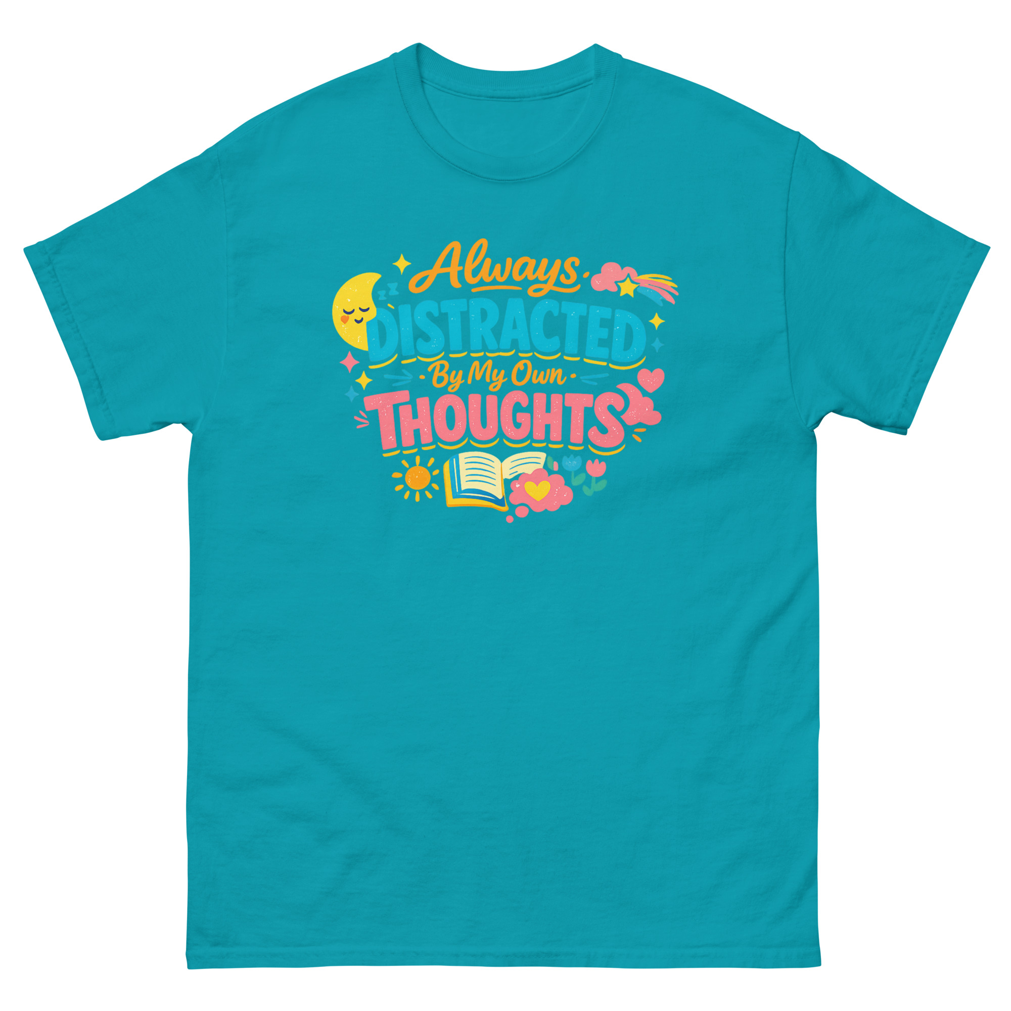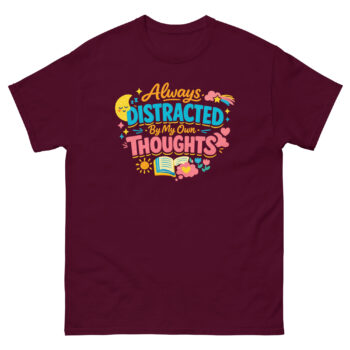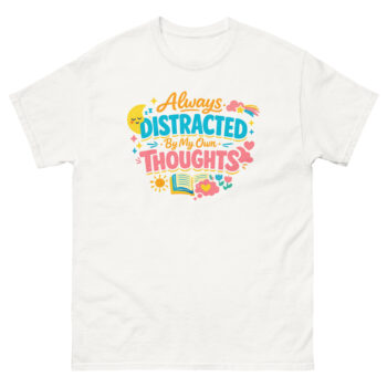 Wear your wonderful, busy mind with pride. The Always Distracted By My Own Thoughts T Shirt is a celebration of introversion, creativity, and a vibrant internal dialogue. If you’re a dreamer personality who loves escapism into your own ideas, this comfortable, colorful tee is for you. Choose your size and make your rich inner world your favorite outfit.