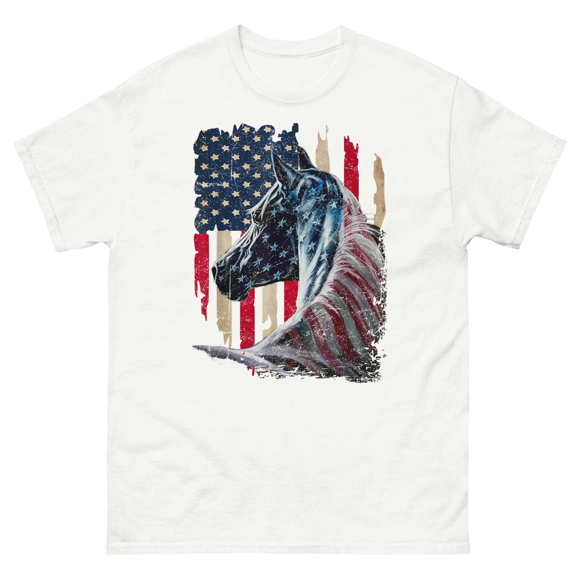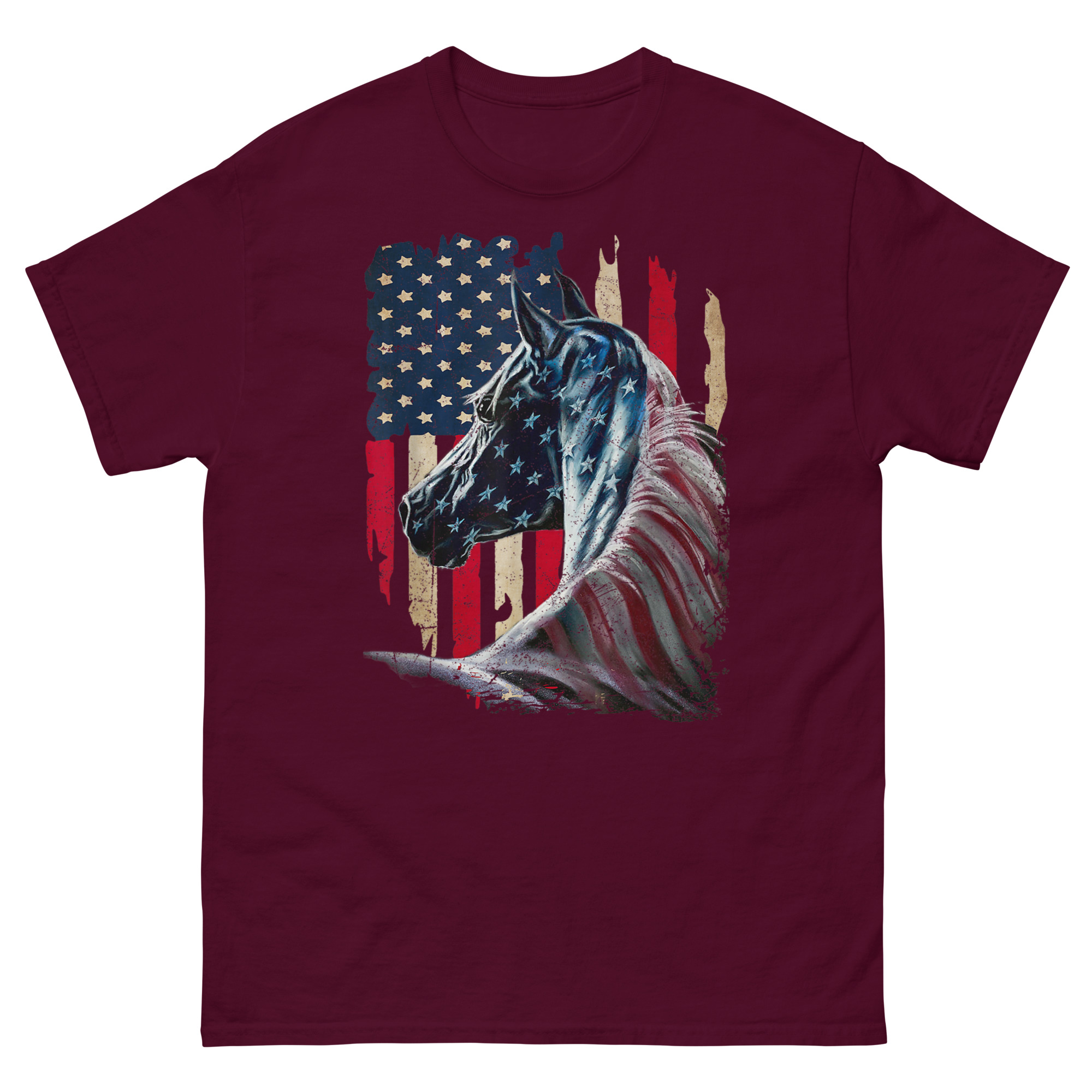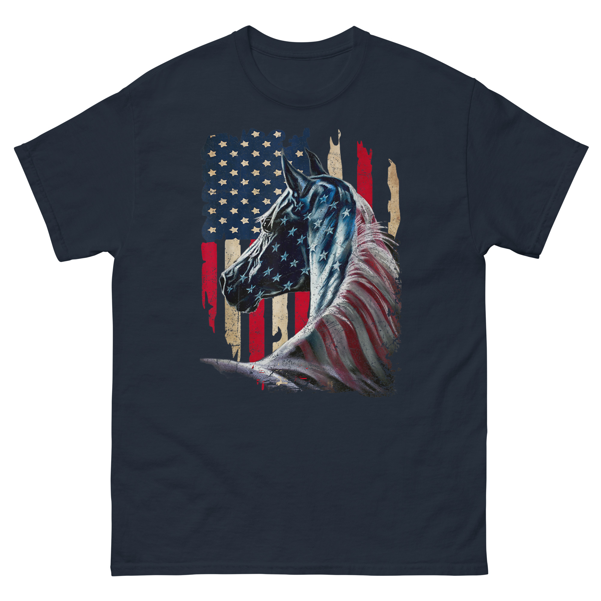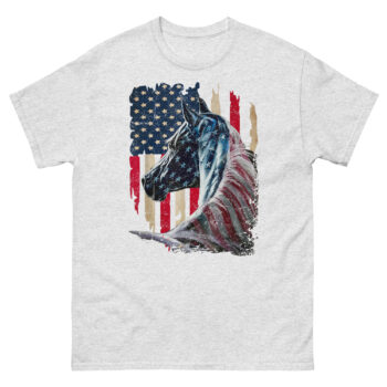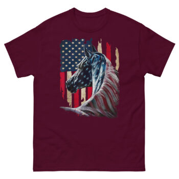 This is a striking, artistic graphic tee that merges two enduring symbols of American freedom into one powerful image. The American Flag With Horse T Shirt features a majestic stallion painted with a distressed, vintage-style flag across its form. It’s the ultimate patriotic equestrian apparel for horse lovers who feel that liberty runs as deep as the mustang’s blood.