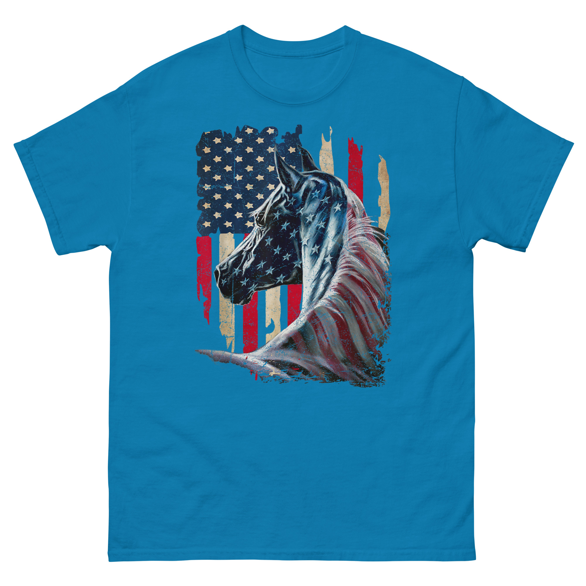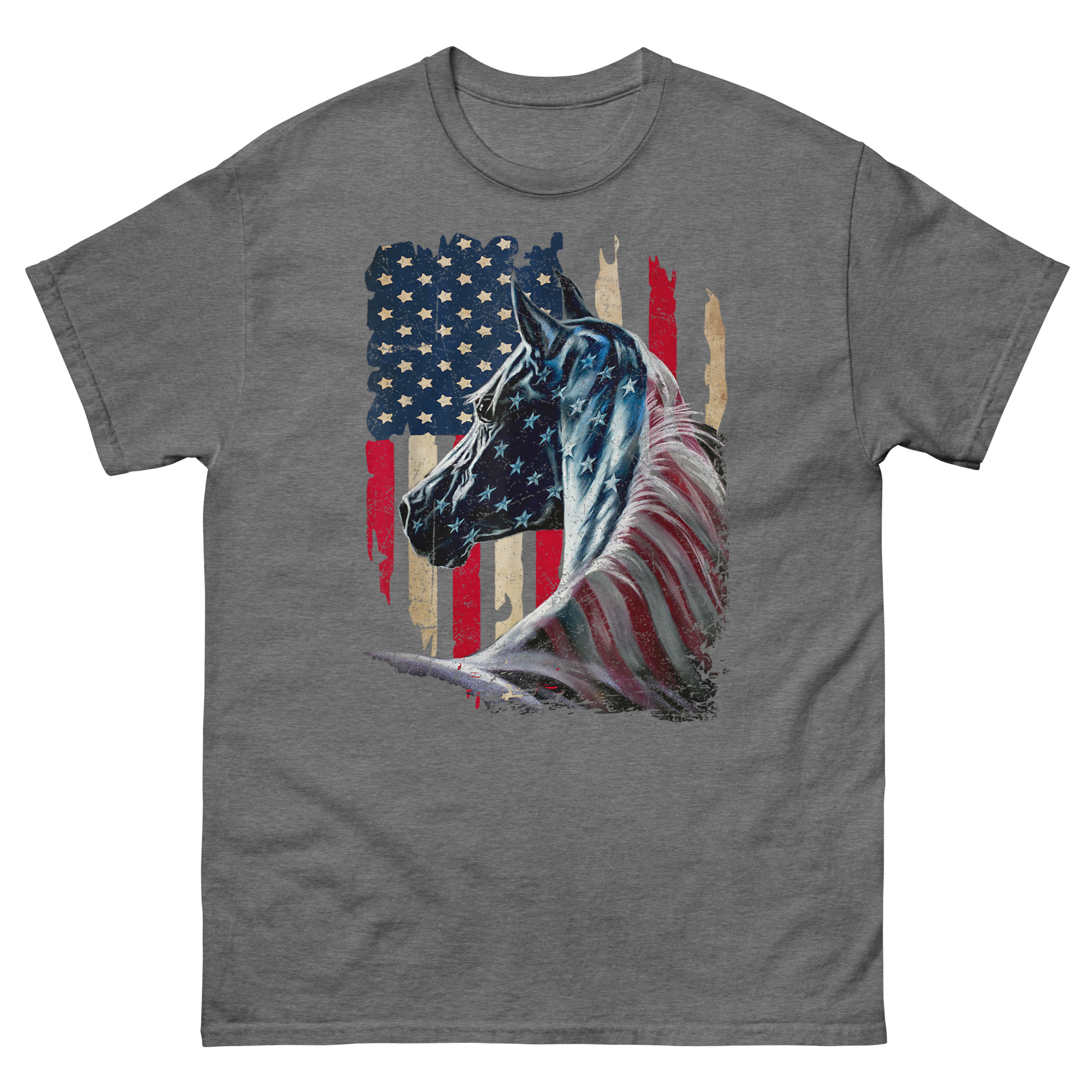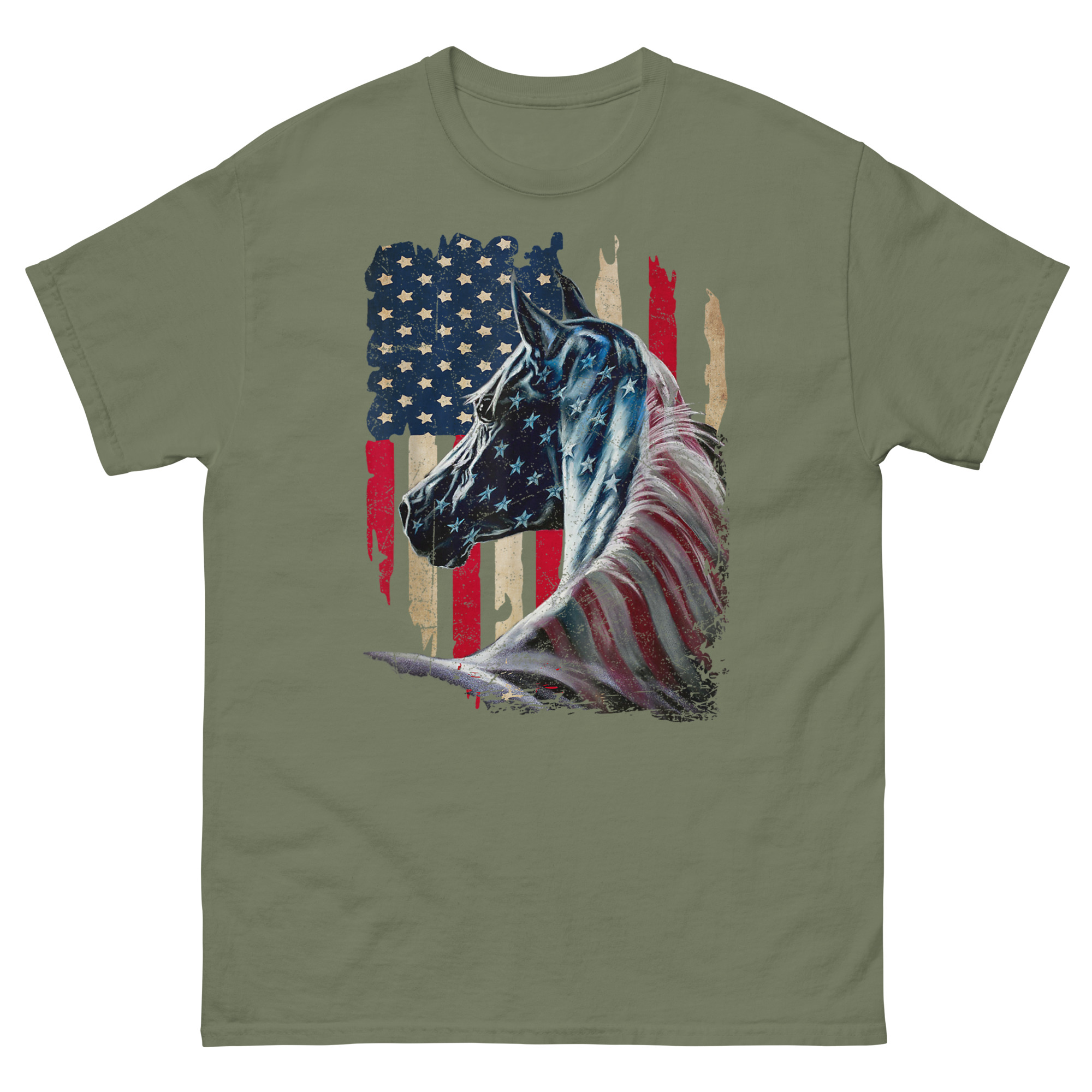 This is a striking, artistic graphic tee that merges two enduring symbols of American freedom into one powerful image. The American Flag With Horse T Shirt features a majestic stallion painted with a distressed, vintage-style flag across its form. It’s the ultimate patriotic equestrian apparel for horse lovers who feel that liberty runs as deep as the mustang’s blood.