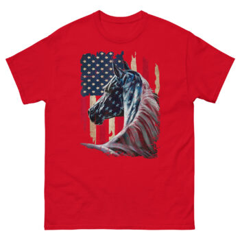 Ready to wear your patriotism as something wild and free? The American Flag With Horse T Shirt is your ultimate vintage style equestrian USA top. This painted flag horse portrait tee is ideal for rodeos, Independence Day, trail rides, or any day you want to carry the spirit of the West with you. It makes a fantastic patriotic horse lover gift for the cowboy, cowgirl, or mustang admirer in your life. Don’t wait to claim this piece of wearable frontier art, click ‘Add to Cart’ now to get your official horse flag graphic tee delivered before your next ride into the sunset.