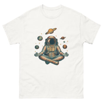 T-shirt featuring a meditating astronaut in lotus pose surrounded by planets and stars. The design combines space exploration with mindfulness and yoga, creating a unique cosmic vibe.