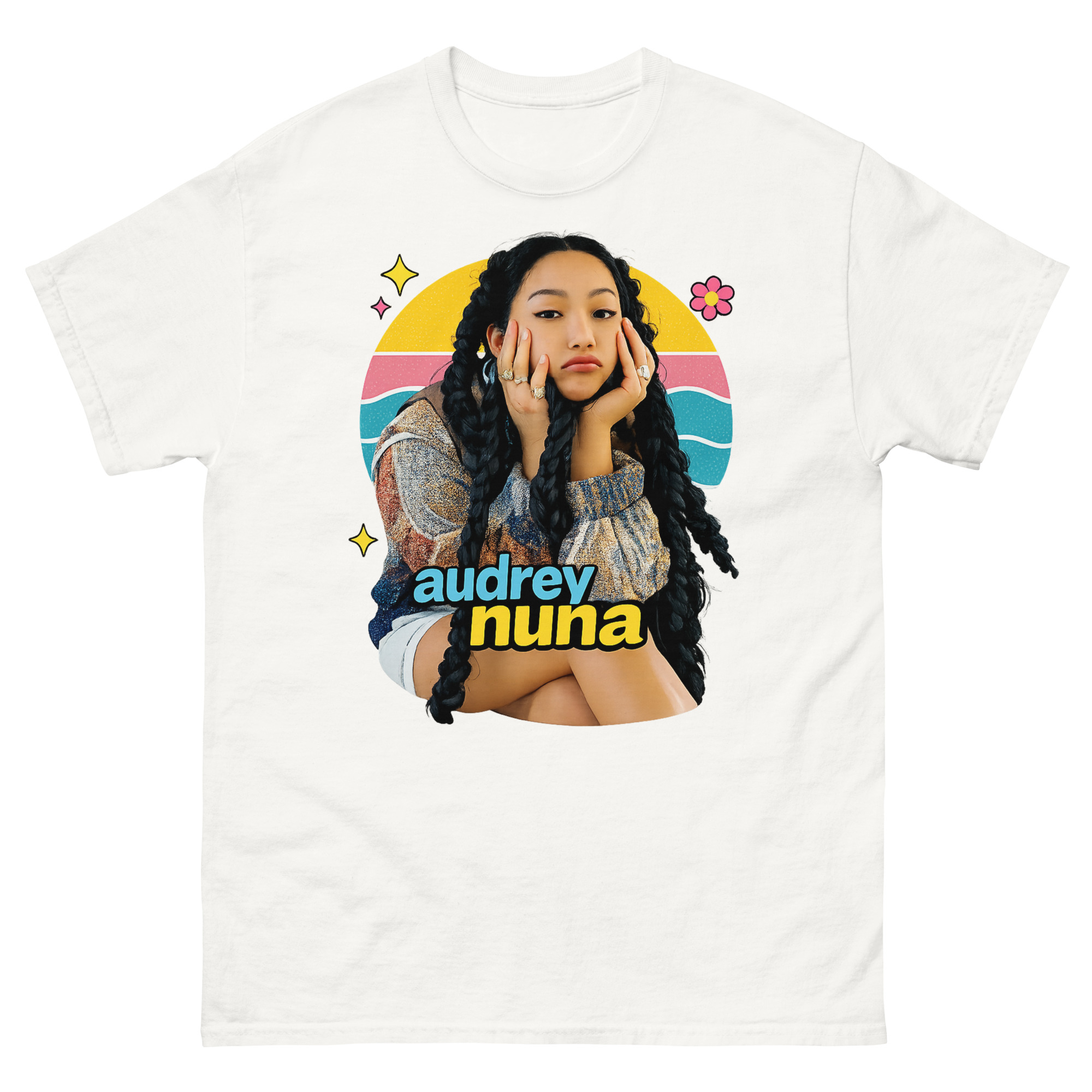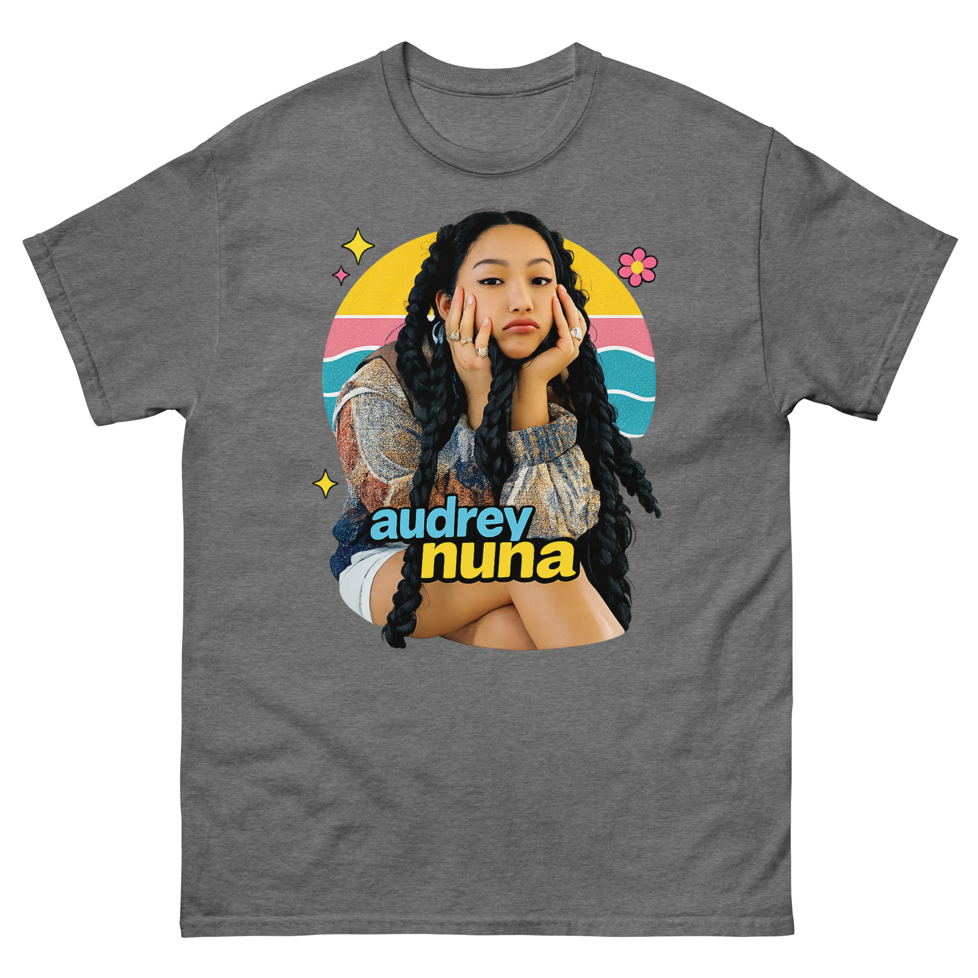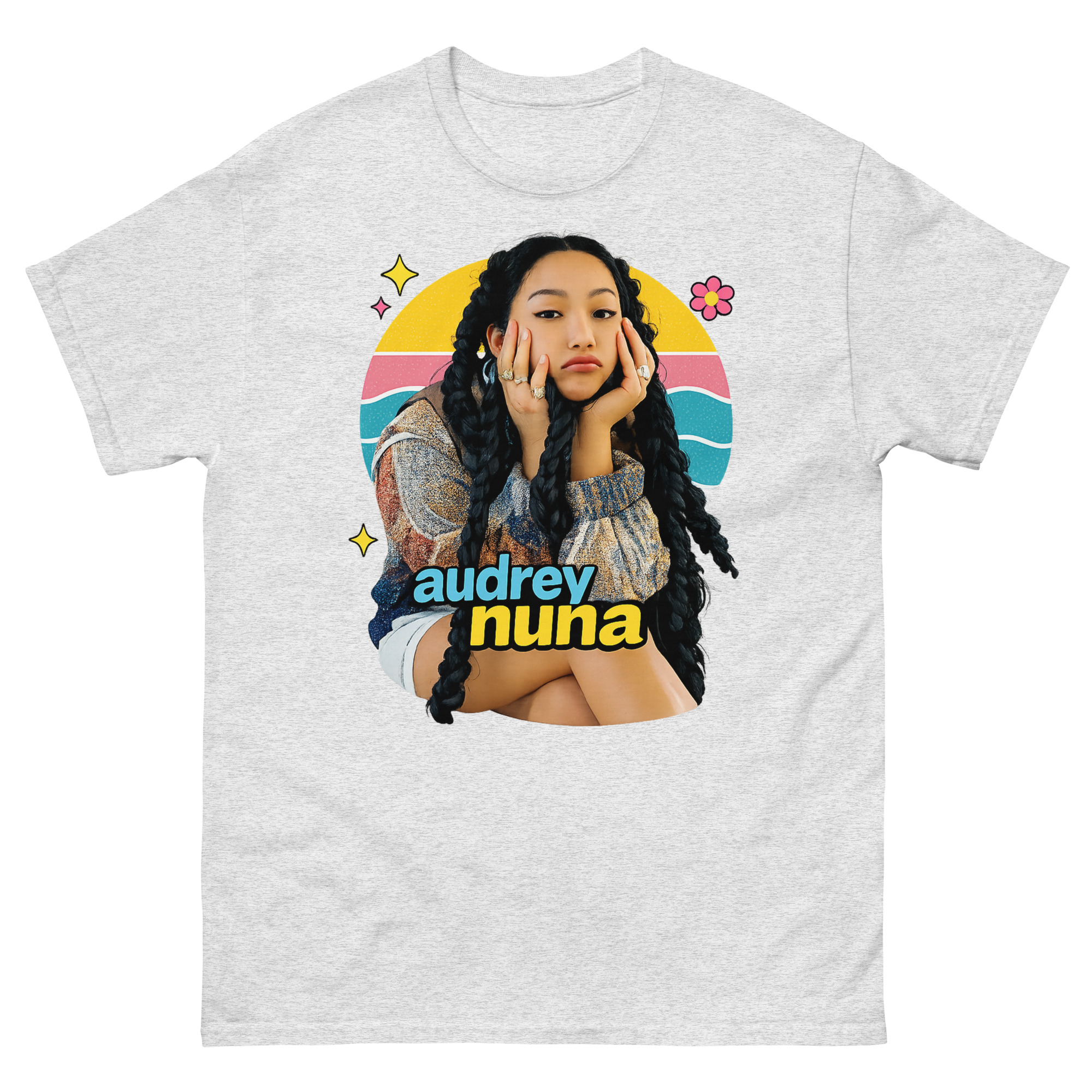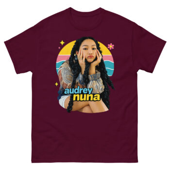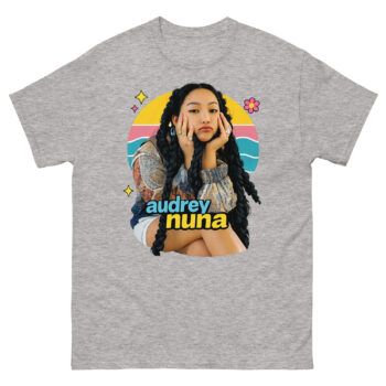 So, what’s the big idea? We call it “Nostalgic Futurism.” Audrey Nuna’s sound is sleek and modern, yet her visuals often give a loving nod to the retro aesthetic of the 90s and Y2K eras. This graphic Audrey Nuna Shirt captures that duality perfectly. Imagine a retro 90s music poster: a vibrant, sunset-colored circle frames a high-definition portrait of Audrey, hands casually framing her face. The bold, stacked typography of her name (with a playful nod to fonts like Comic Sans) finishes the look. Ultimately, it’s designed to make you feel like “The Coolest Girl in the Room.”