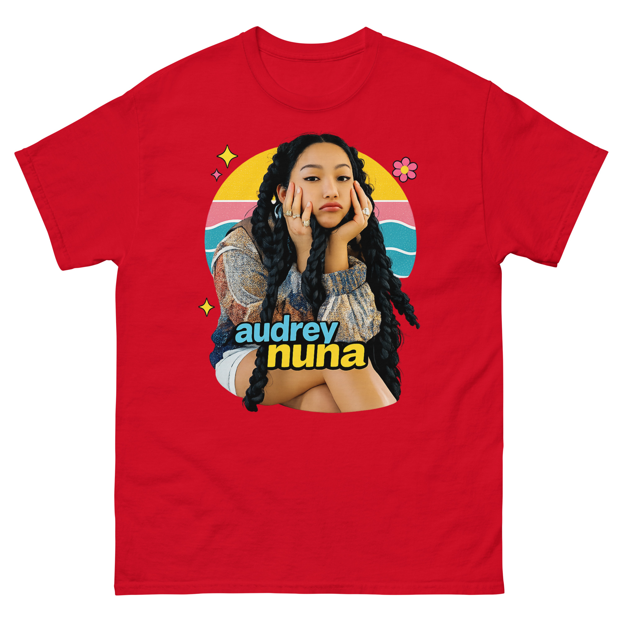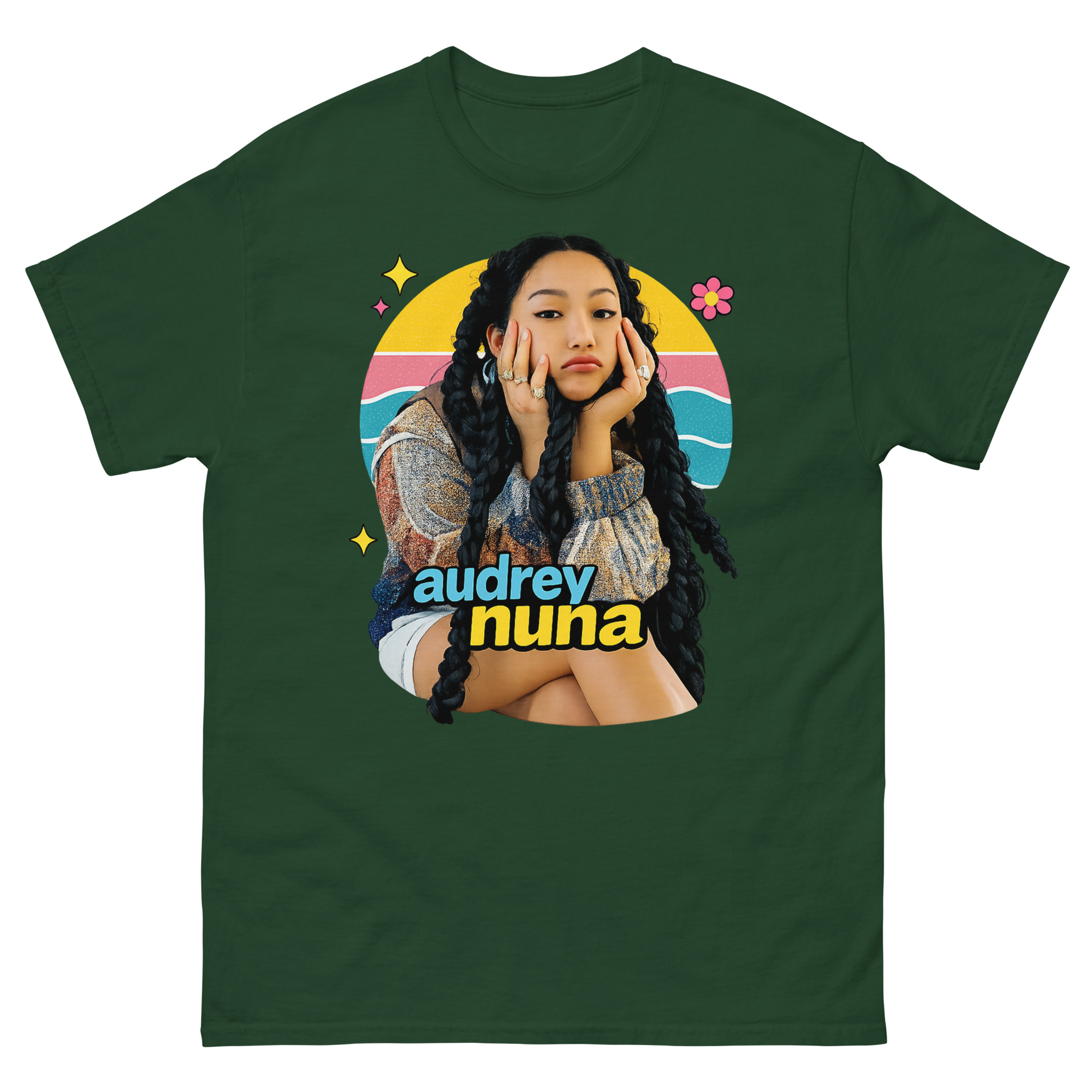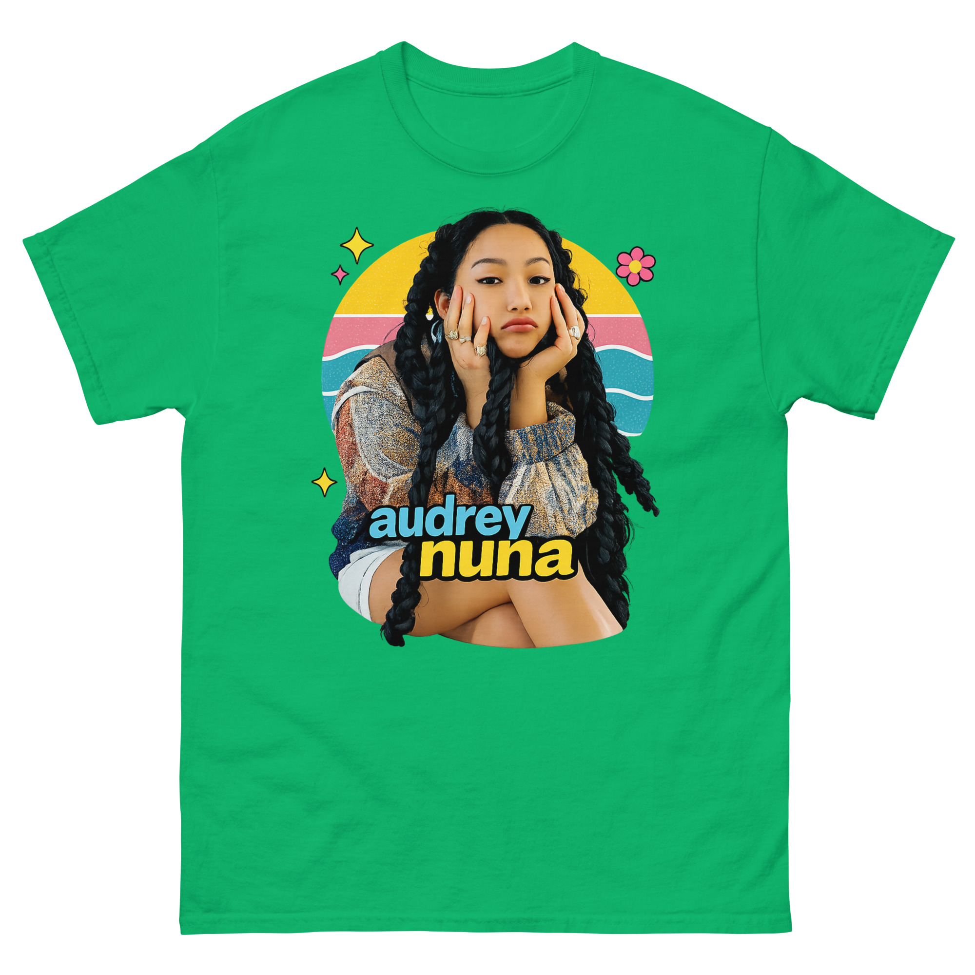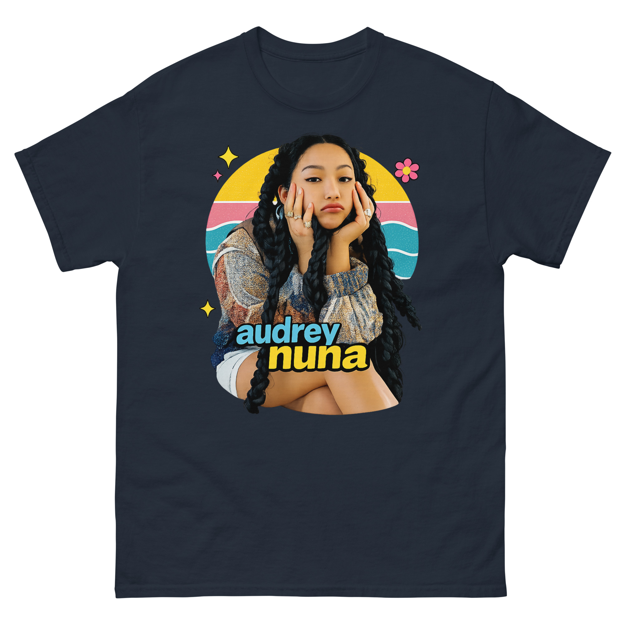 So, what’s the big idea? We call it “Nostalgic Futurism.” Audrey Nuna’s sound is sleek and modern, yet her visuals often give a loving nod to the retro aesthetic of the 90s and Y2K eras. This graphic Audrey Nuna Shirt captures that duality perfectly. Imagine a retro 90s music poster: a vibrant, sunset-colored circle frames a high-definition portrait of Audrey, hands casually framing her face. The bold, stacked typography of her name (with a playful nod to fonts like Comic Sans) finishes the look. Ultimately, it’s designed to make you feel like “The Coolest Girl in the Room.”