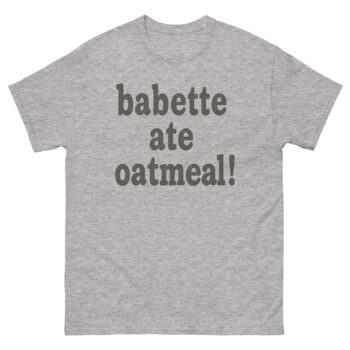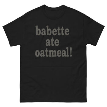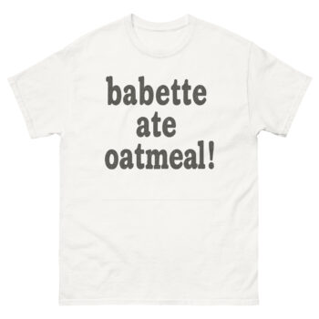 Relive one of Stars Hollow’s most iconic and hilarious moments with our “Babette ate oatmeal!” t-shirt! This classic Gilmore Girls quote, famously delivered by Kirk, is printed on a super soft, comfortable tee, for binge-watching your favorite episodes or a casual stroll through town. It’s a subtle yet instantly recognizable nod to the beloved series, making it an ideal gift for any Gilmore Girls enthusiast. Show your love for Lorelai, Rory, and the quirky residents of Stars Hollow with this unique piece of fan apparel.