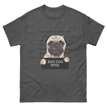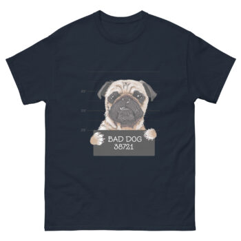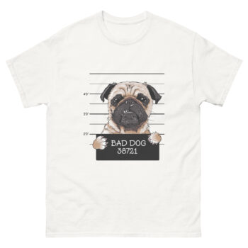 If you’ve ever had a mischievous pup who chewed your favorite shoes or stole food from the table, you’ll love the Bad Dog Mugshot T-Shirt. This funny pug shirt features an adorable yet grumpy pug holding a classic mugshot sign—perfect for showcasing your dog’s “criminal” antics in the most humorous way.