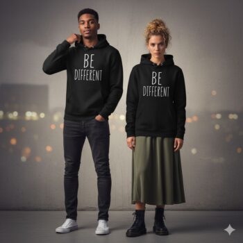 Embrace your individuality with our exclusive “Be Different” hoodie. This isn’t just a piece of clothing; it’s a statement. The minimalist white text on a classic black background creates a bold, versatile look that pairs cool with any outfit.