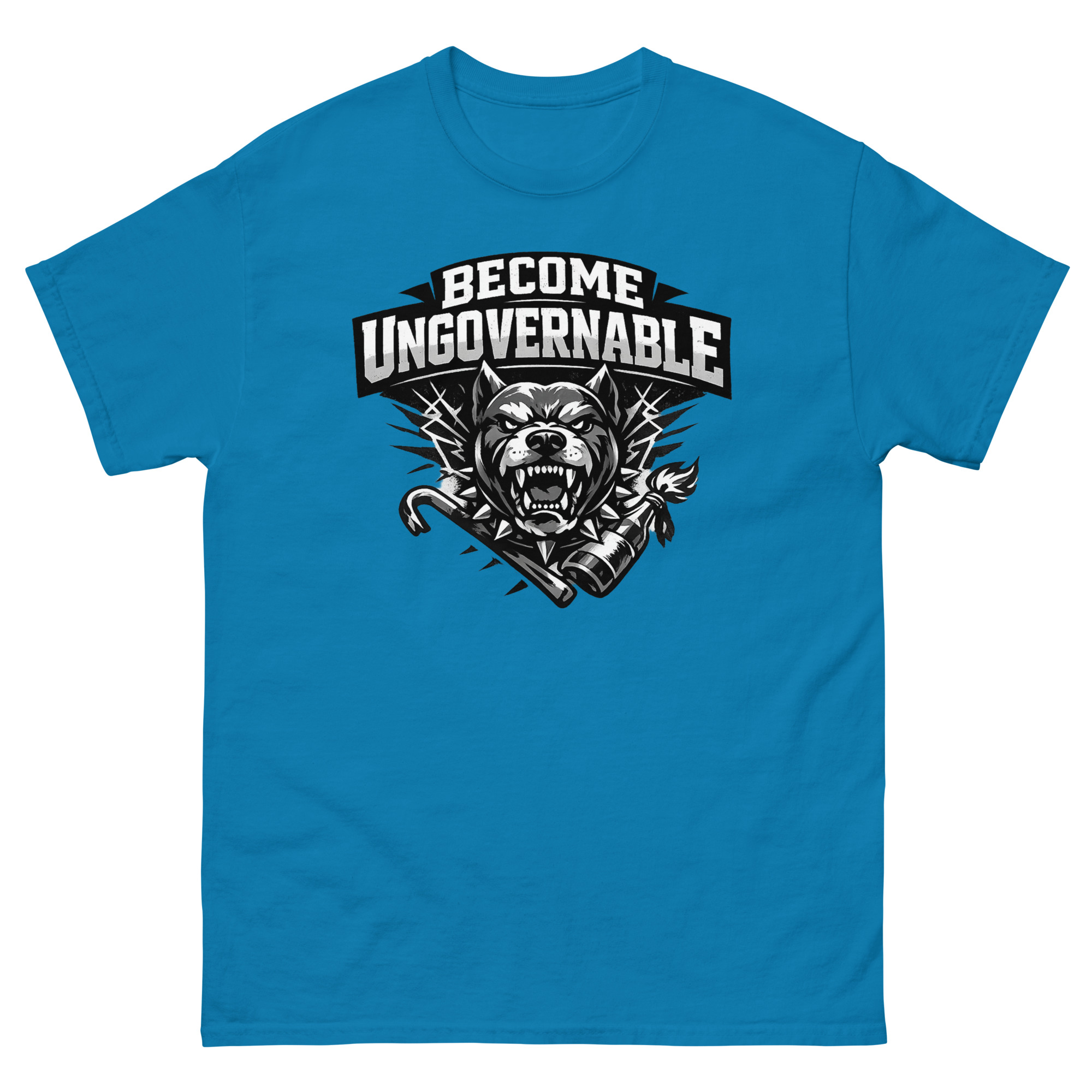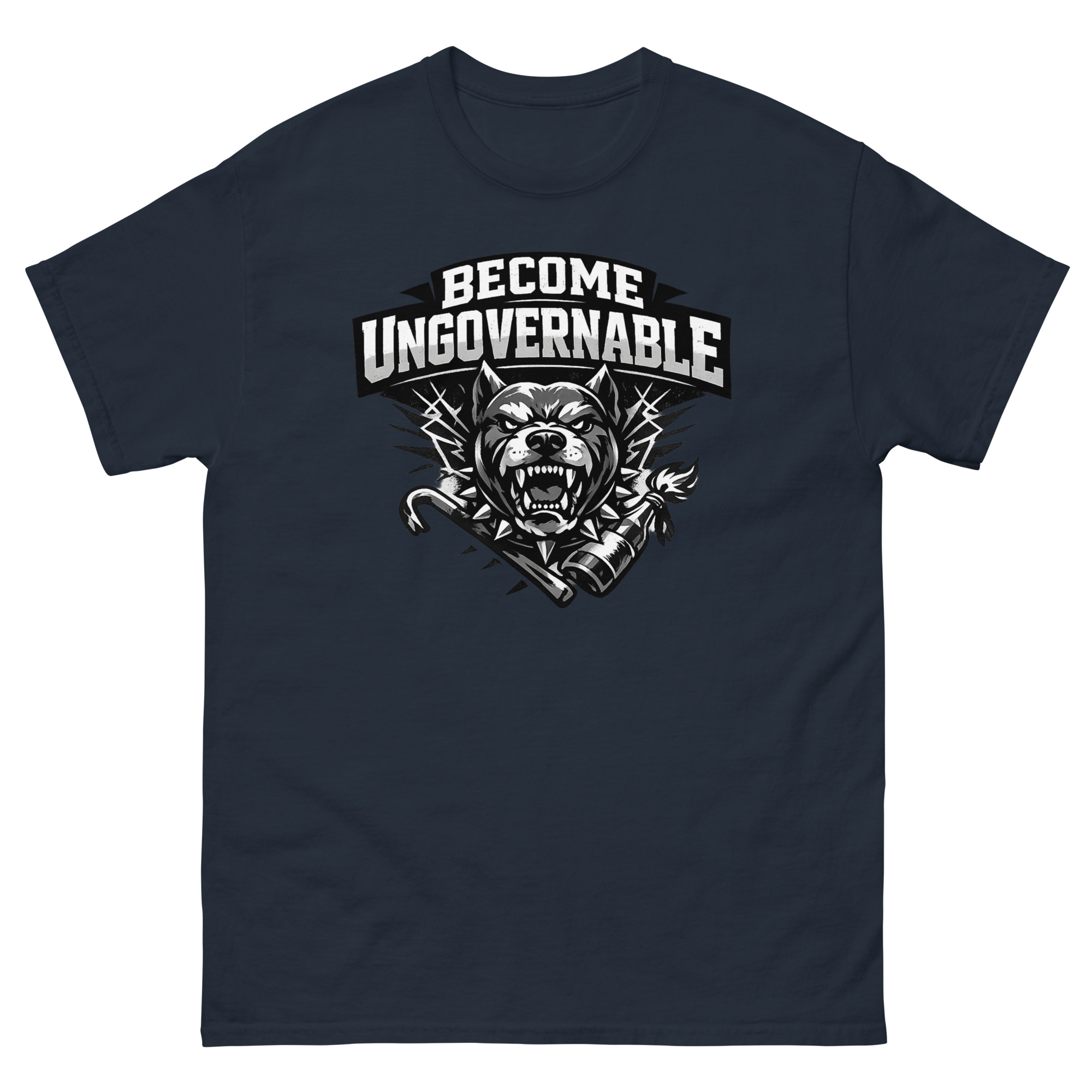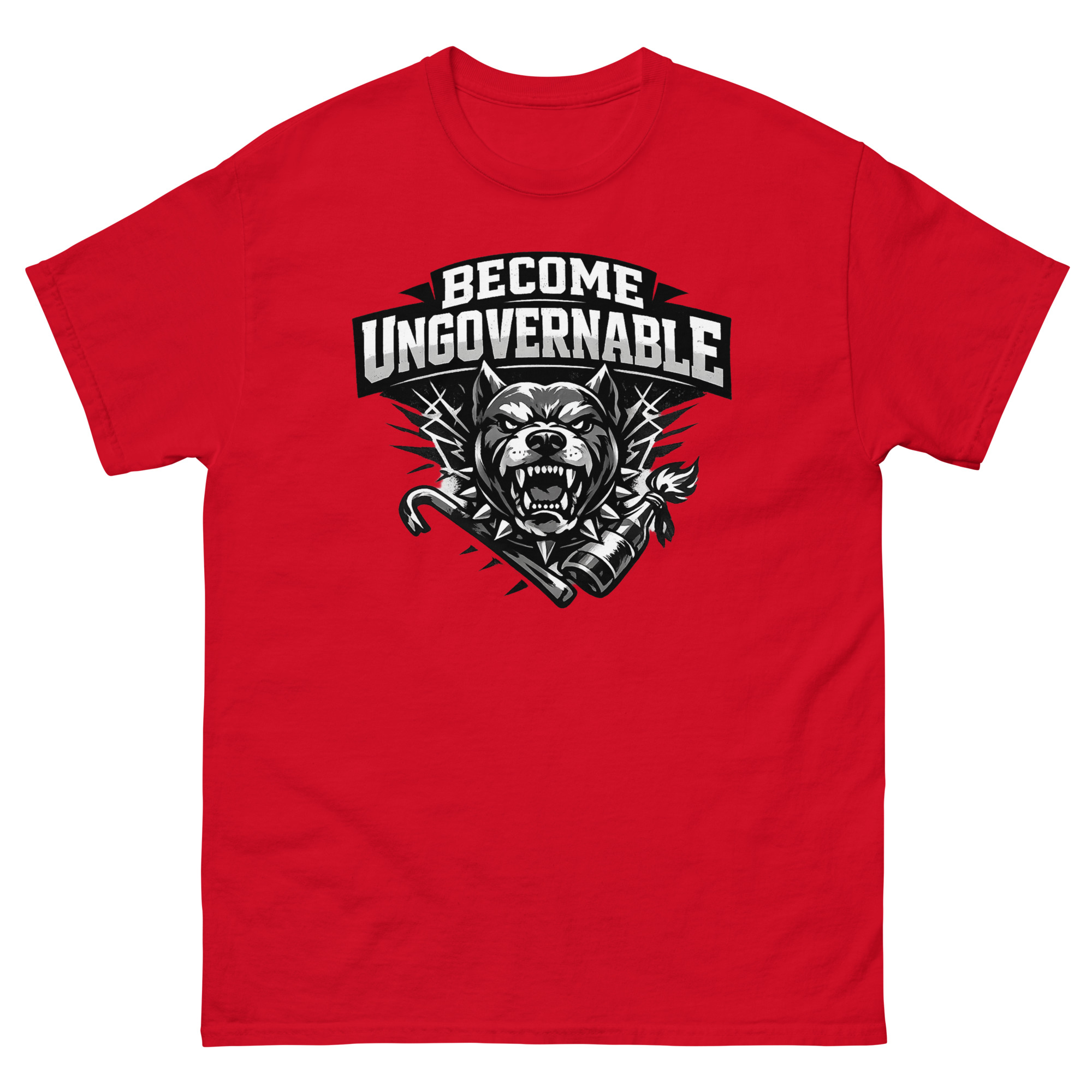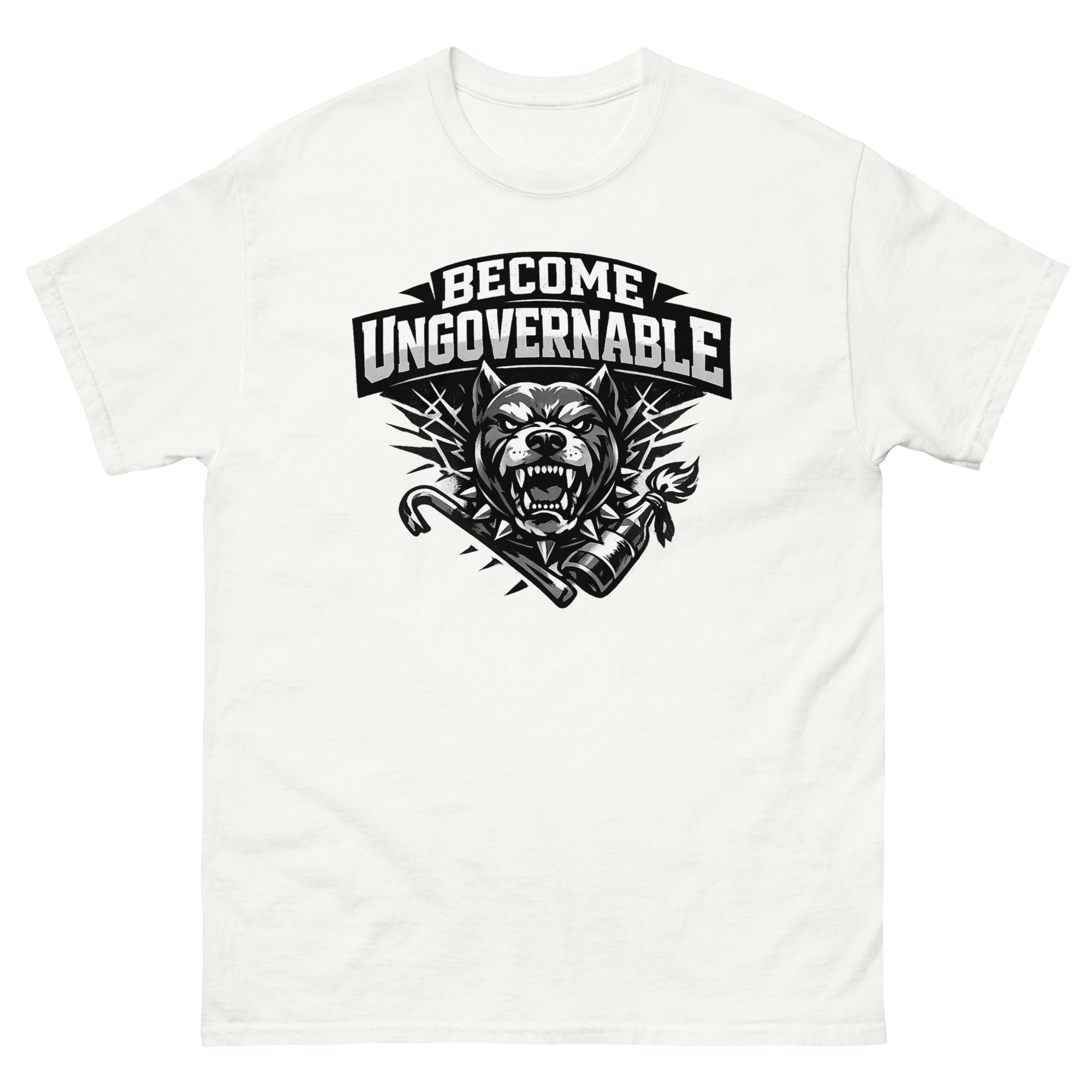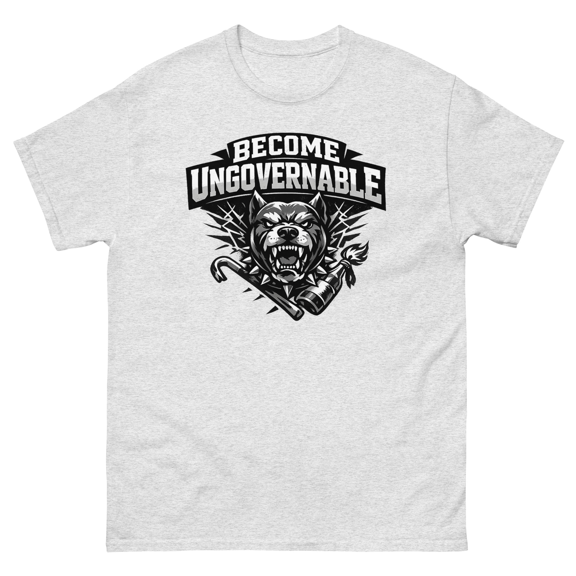The Become Ungovernable Dog T Shirt is a powerful graphic tee that reimagines man’s best friend as a symbol of fierce independence. Its unique design features a snarling dog in a spiked collar, backed by crossed tools of rebellion in a gritty, distressed aesthetic. This shirt is designed for urban streetwear fans, punk rock enthusiasts, and dog owners who appreciate a rebellious twist.