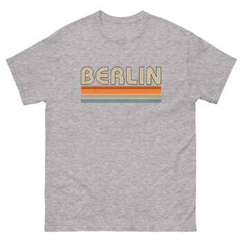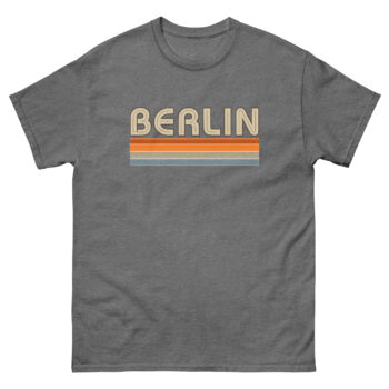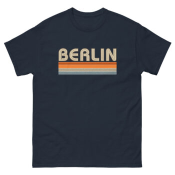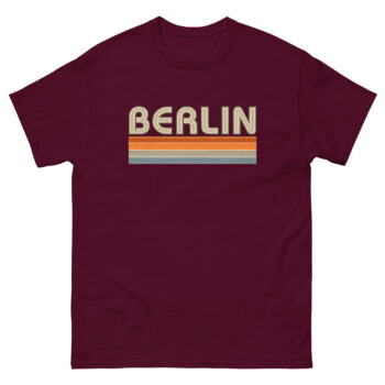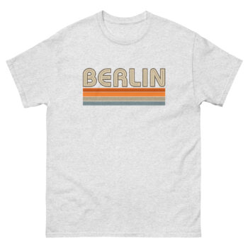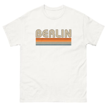 The magic of this Berlin gift apparel is in its thoughtful, minimalist design. The bold, all-caps “BERLIN” uses a classic serif font with subtle distressing, giving it an authentic, timeworn feel that whispers history. Underneath, four horizontal stripes in muted, earthy tones tell their own color story of the city. This design is balanced, centered, and intentionally faded for a vibe that is both nostalgic and effortlessly cool. It’s the perfect retro Berlin shirt design for those who appreciate style with substance.