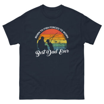 The bold text “Born to Fish, Forced to Work – Best Dad Ever” strikes the perfect balance between humor and sentiment. It’s a funny fishing shirt for working dads that also reminds him why he does it all—for family.