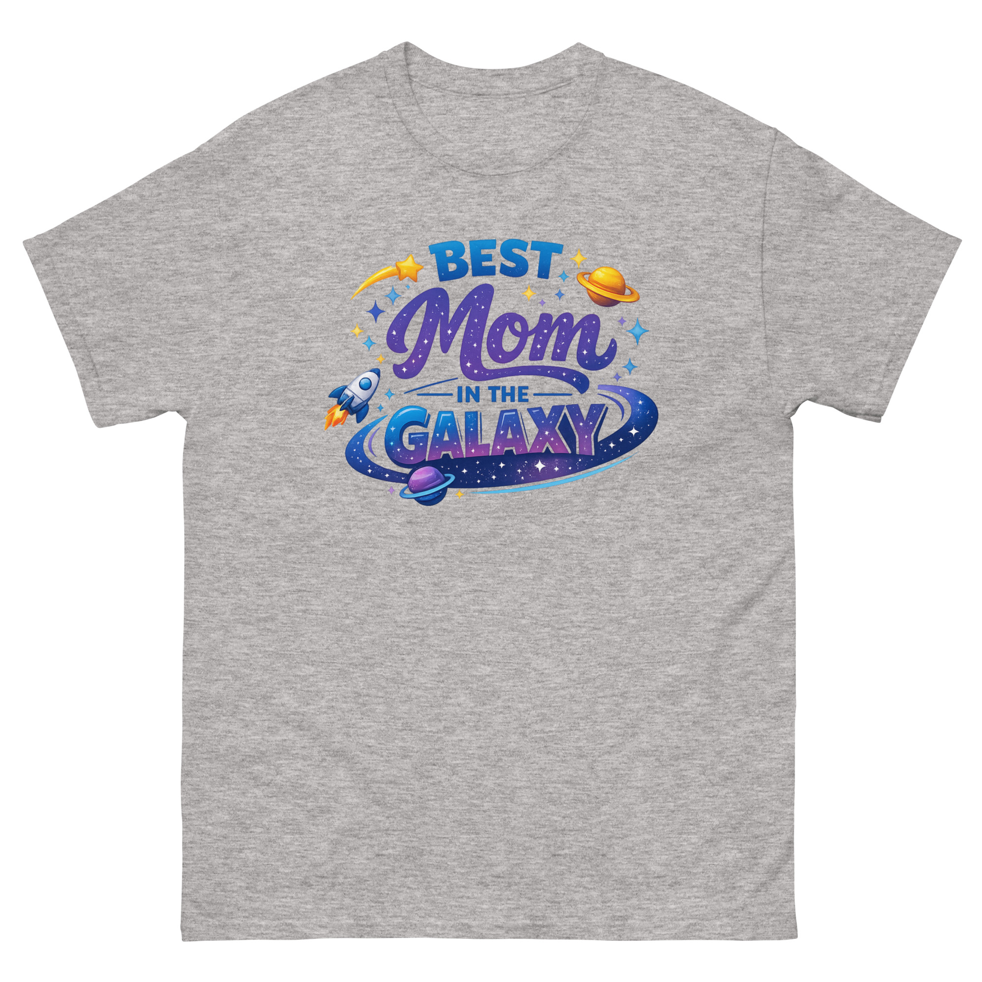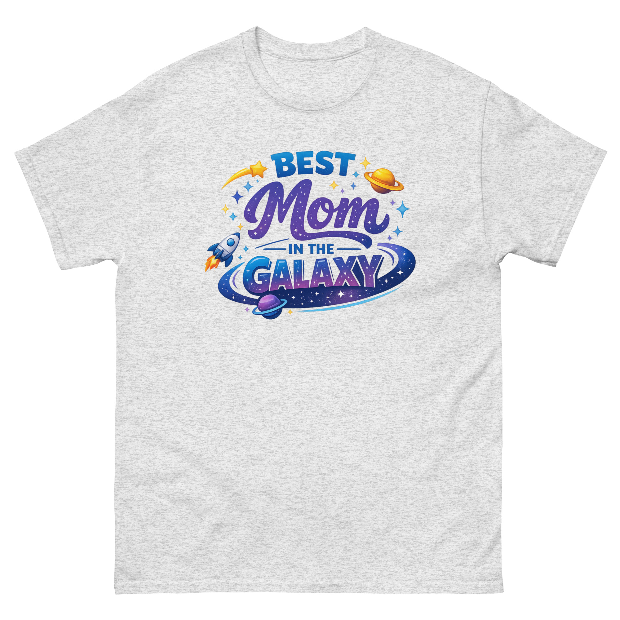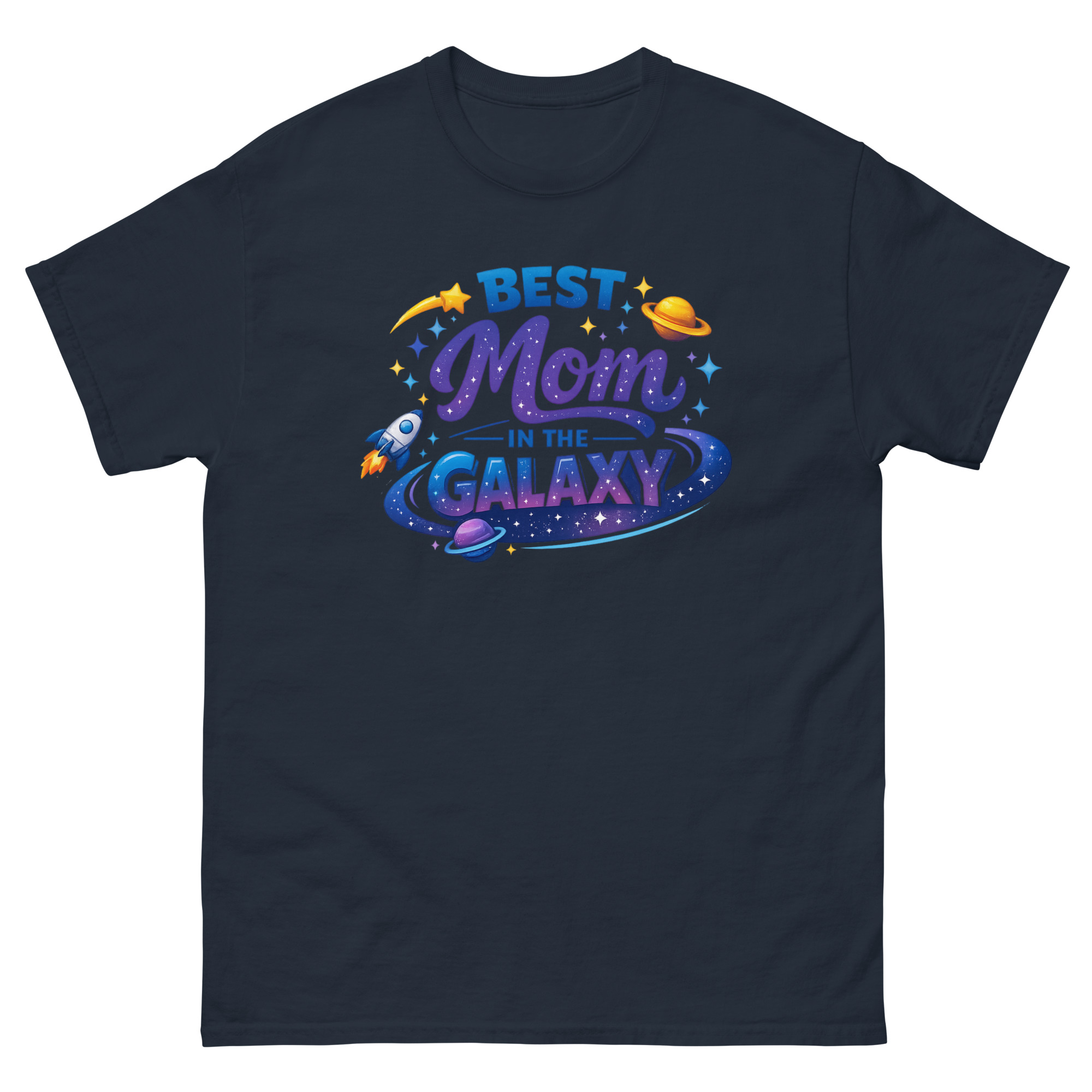 The design is a mini celestial scene. The word “GALAXY” sits inside a colorful nebula ring, while a rocket ship blasts off nearby, symbolizing the exciting journey of motherhood. The shooting star and scattered stardust add a touch of magic. This makes the shirt a perfect piece of interstellar themed apparel for a science teacher mom, a birthday gift for moms who love space, or any adventurous mom with a whimsical side.