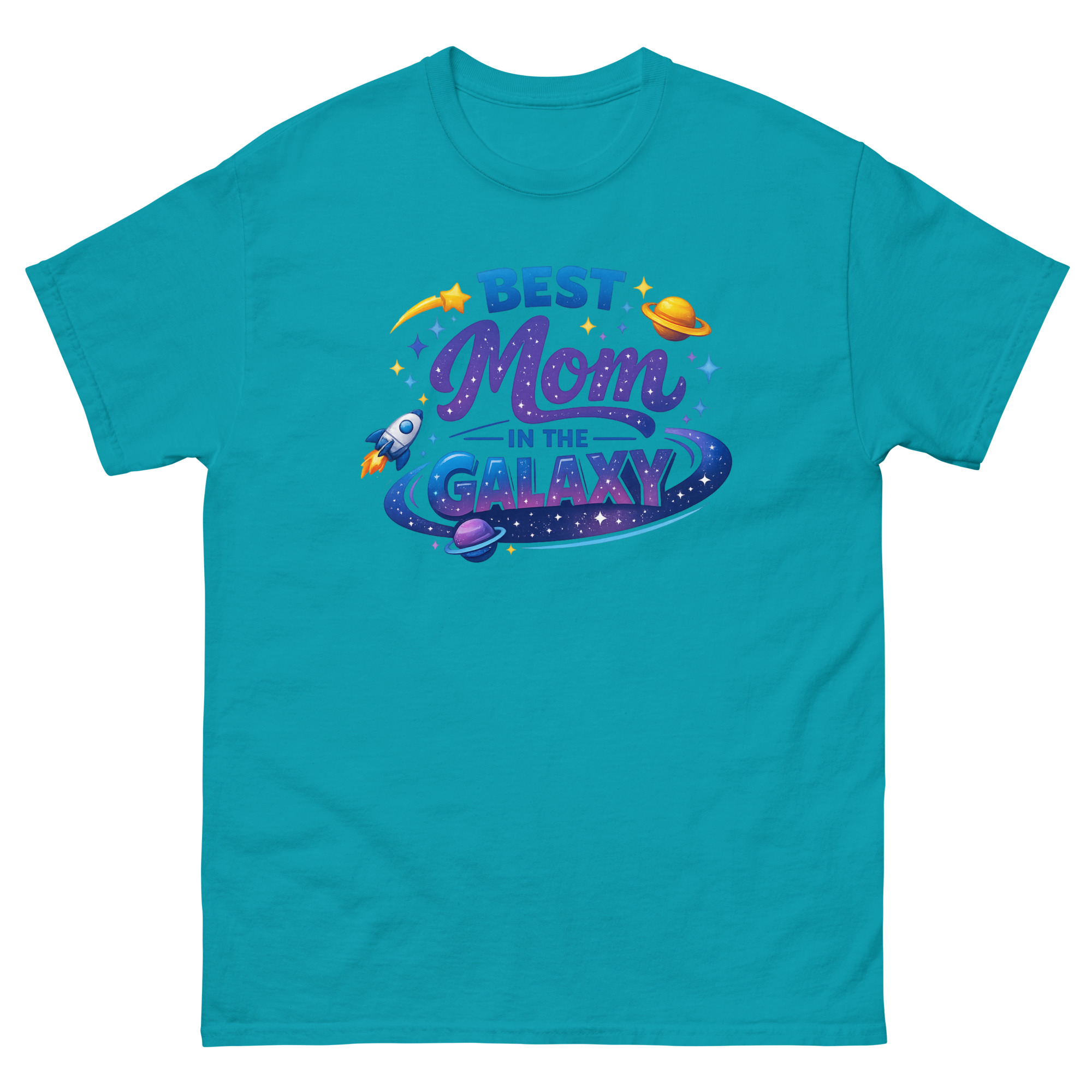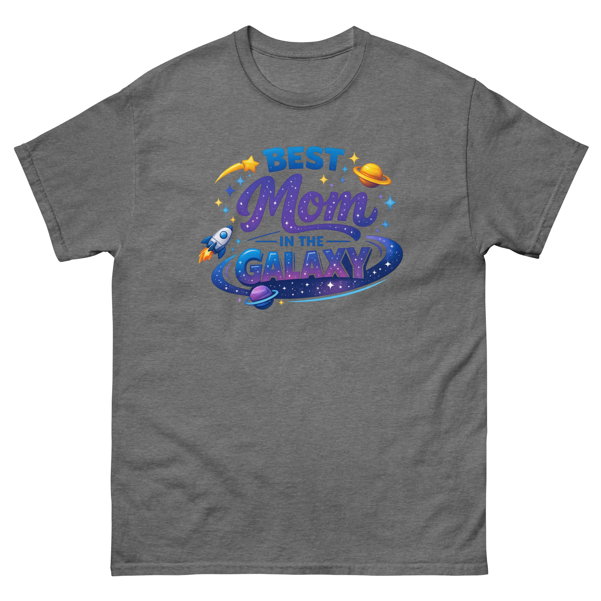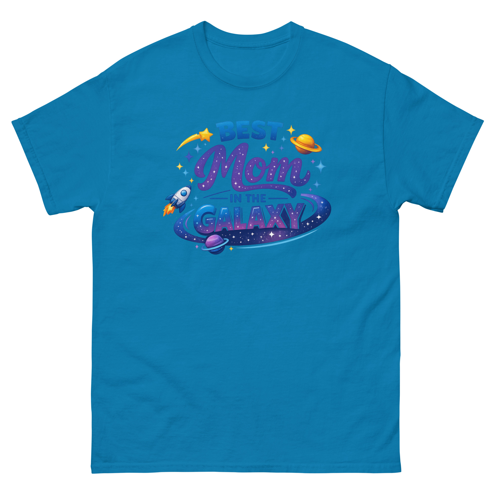 The design is a mini celestial scene. The word “GALAXY” sits inside a colorful nebula ring, while a rocket ship blasts off nearby, symbolizing the exciting journey of motherhood. The shooting star and scattered stardust add a touch of magic. This makes the shirt a perfect piece of interstellar themed apparel for a science teacher mom, a birthday gift for moms who love space, or any adventurous mom with a whimsical side.