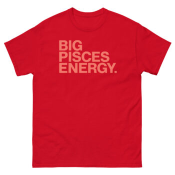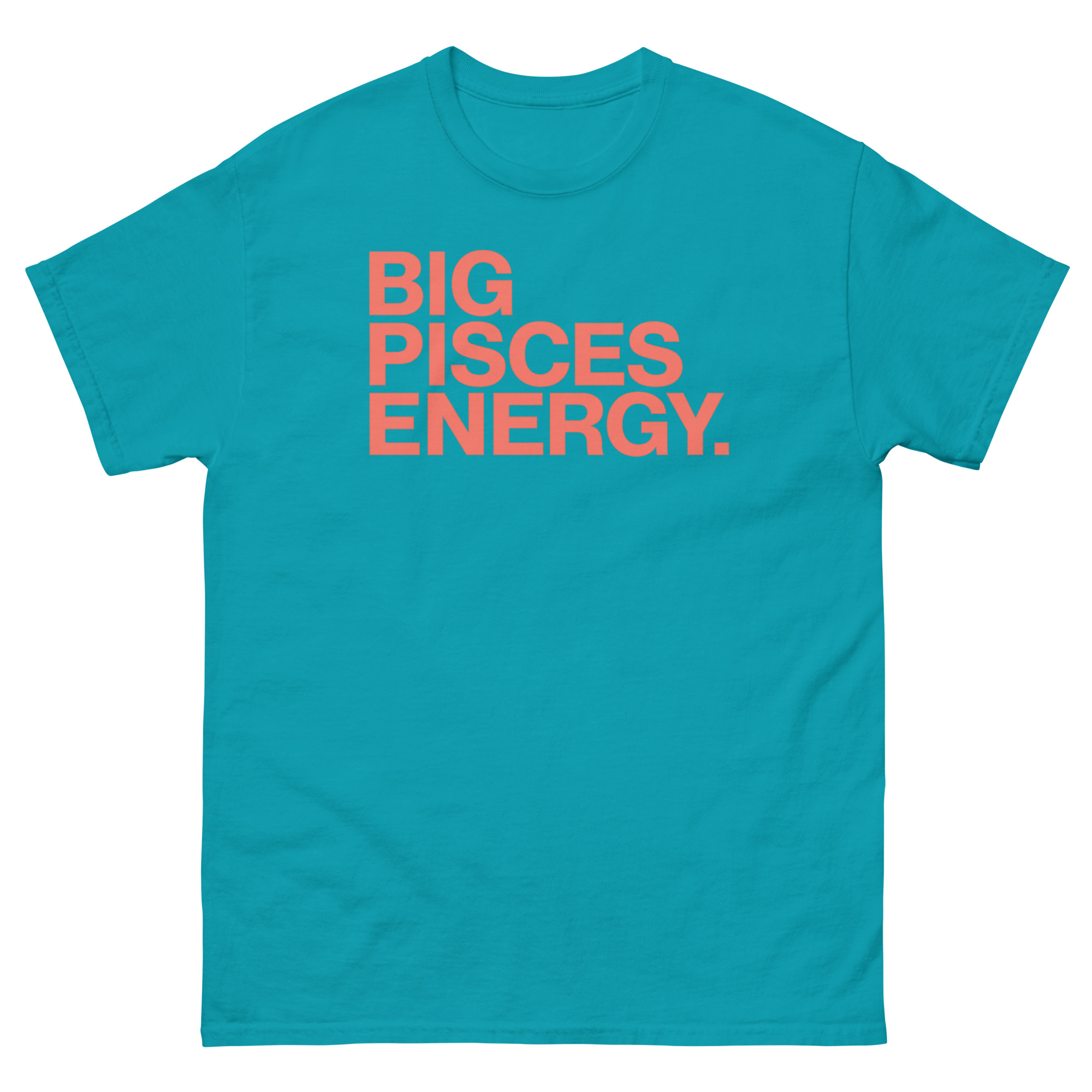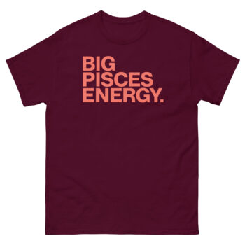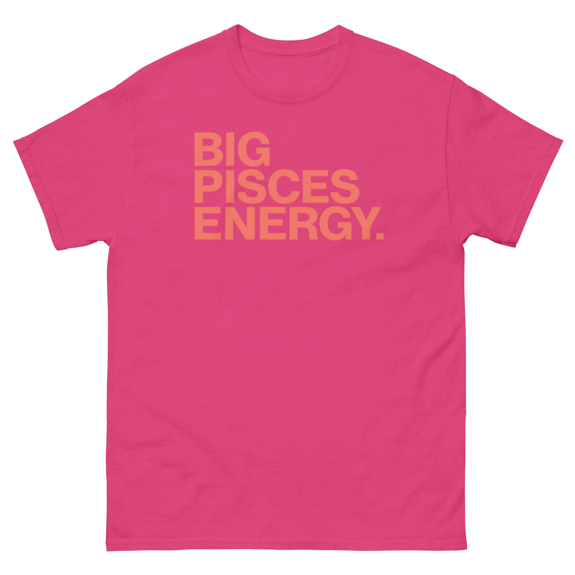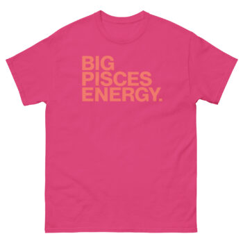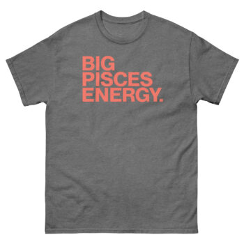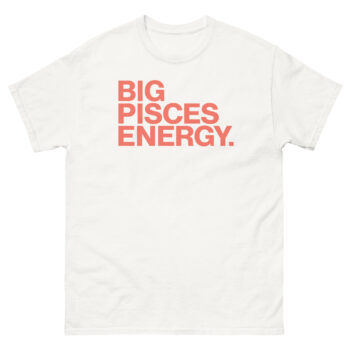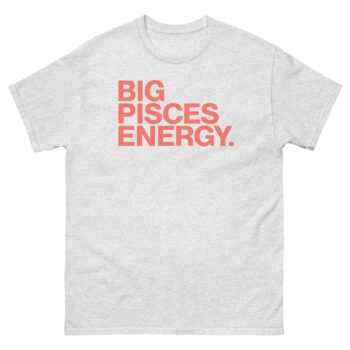 The layout strips everything away. Three lines left-aligned on the chest: “BIG,” “PISCES,” “ENERGY.” followed by a period. The period matters, it closes the statement like a fact, not a question. The font is bold and modern, no serifs or flourishes to soften the impact. And the color? Salmon-peach. Not water blue, not sea foam. Something warmer. Something that reflects the creativity and unconventional nature of February and March birthdays.