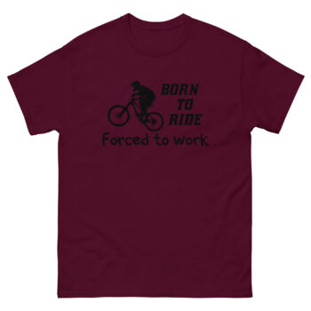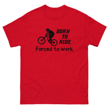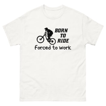 Firstly, the design hits home because it’s authentic. The bold, black silhouette of a rider in their element says “BORN TO RIDE” with unshakable confidence. Conversely, the sly, lowercase “forced to work” whispers the universal truth we all acknowledge. This MTB rider humor shirt doesn’t just make people laugh; it creates an instant connection. It tells your fellow riders, “I get it,” and explains to everyone else why you’re always checking the weather forecast. Ultimately, it’s the ultimate inside joke for anyone who lives for the weekend’s two-wheeled adventures.