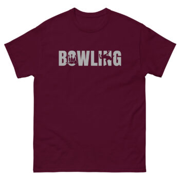 This shirt puts the sport front and center with a bold typographic design. The word “BOWLING” is cleverly filled with icons—bowling pins in the “O” and a bowler silhouette in the “I”—creating a sleek, modern look for fans of the lane life.