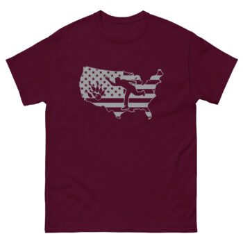 Hit a strike in style with our american flag bowling ball shirt! Designed for true bowling lovers, this graphic tee features a bowler in action, layered over a patriotic American flag and map outline. Whether you’re at the lanes or just showing off your passion for the sport, this shirt makes a bold statement.
