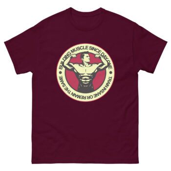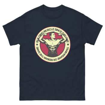 The Building Muscle Since Day One t-shirt is made for serious lifters and gym warriors who refuse to settle. Featuring a bold vintage-style graphic of a flexing bodybuilder inside a red-and-cream circular emblem, it carries the powerful mantra “Train Insane or Remain the Same.” This shirt isn’t just apparel — it’s a declaration of commitment to your fitness journey.