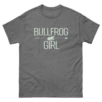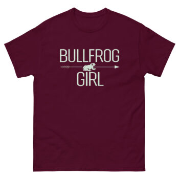 For the true bullfrog enthusiast, this “Bullfrog Girl” t-shirt is a bold way to show off your love for frogs. Featuring simple text with a bullfrog and arrow graphic, this tee is perfect for nature lovers, frog collectors, and anyone proud to be a bullfrog girl.