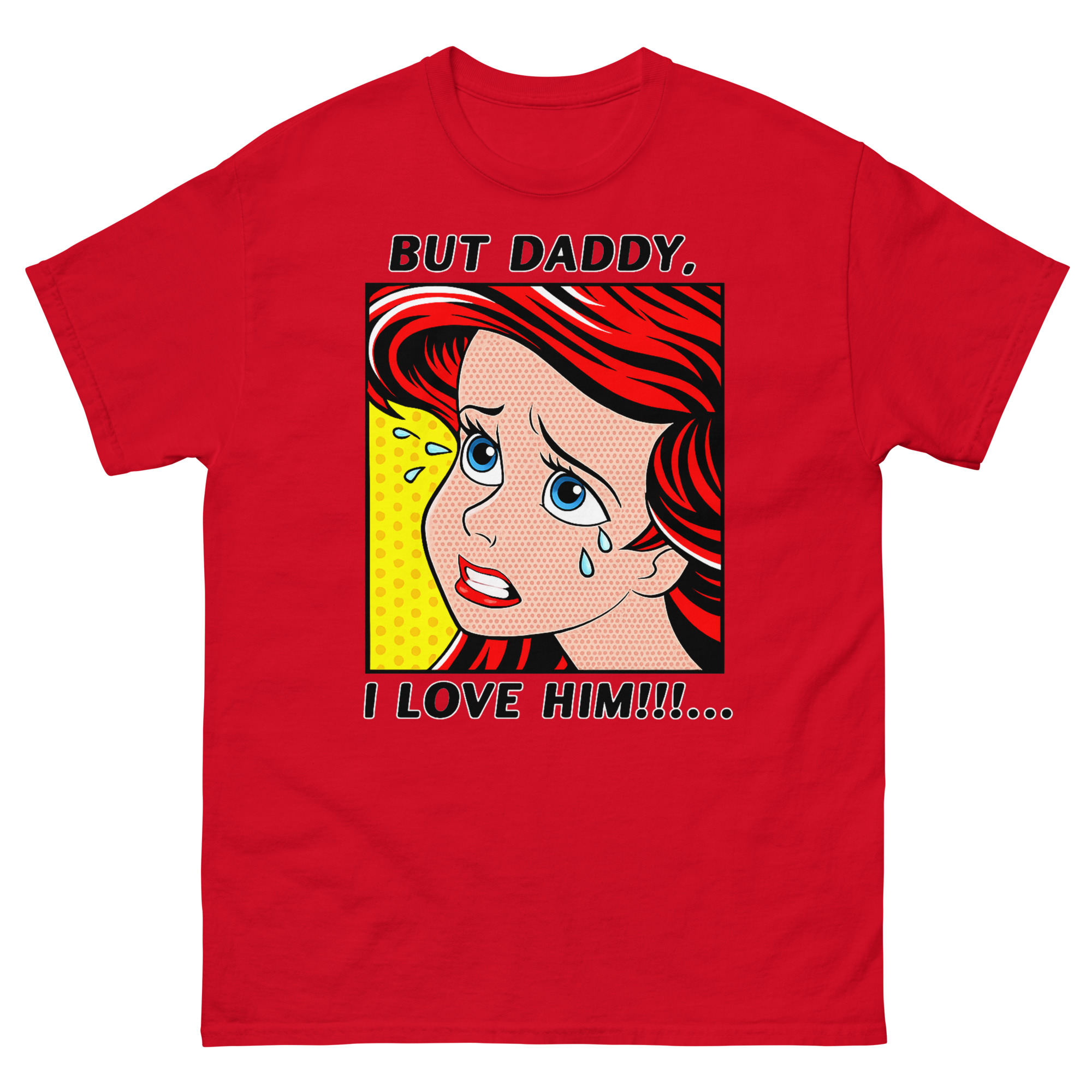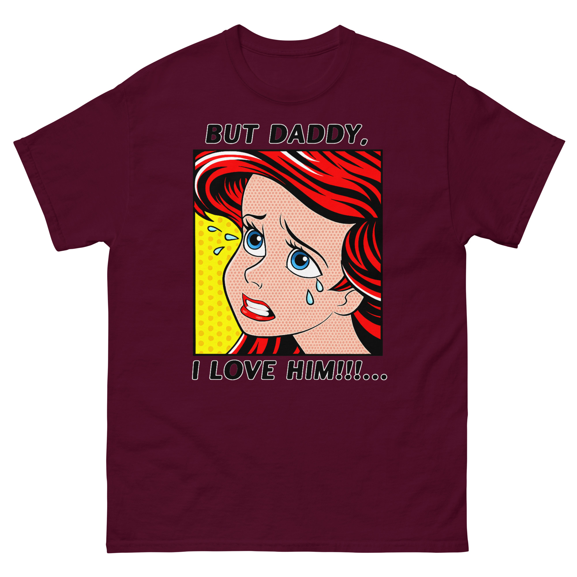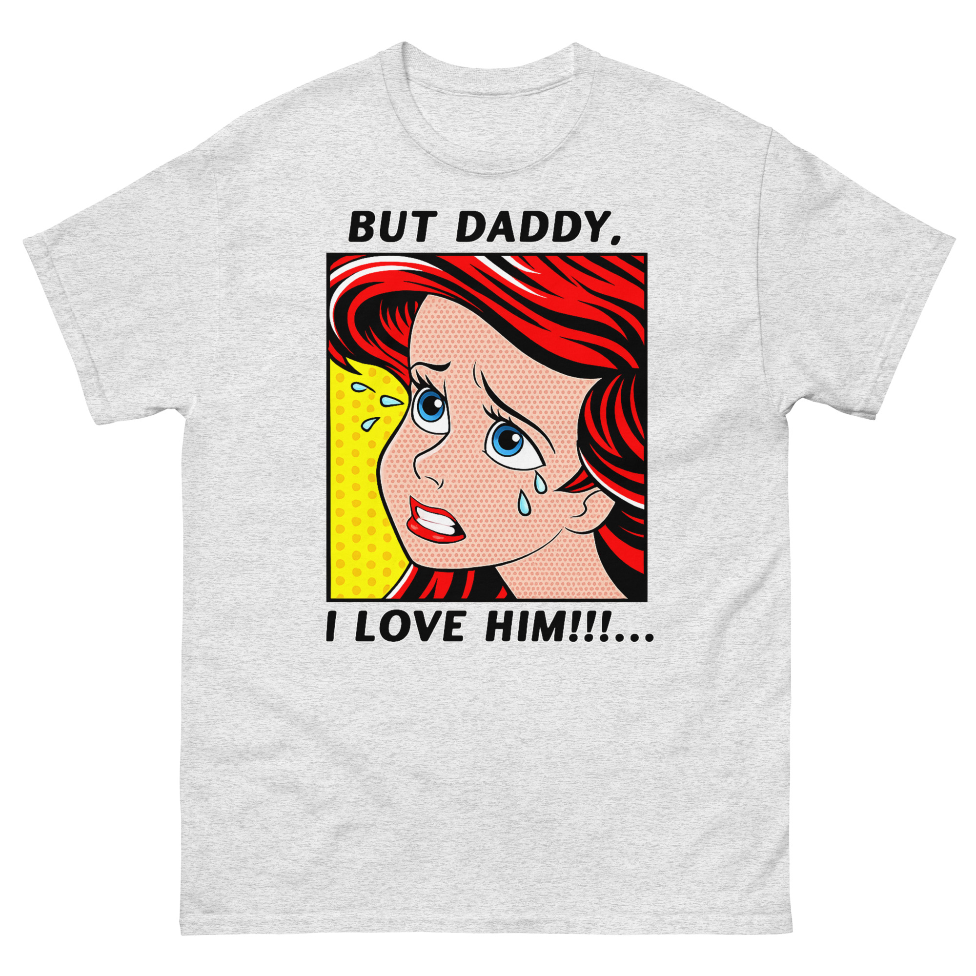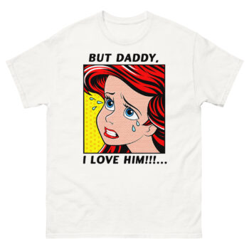 The result But Daddy I Love Him Shirt is this unique vintage comic book fan apparel. The vibrant red hair, blue tears, and classic yellow Ben-Day dot background capture that over-the-top, melodramatic feeling perfectly. It’s a nod to two different eras of art and music colliding. For example, it’s an ideal concert outfit idea for fans who want to show their style and sense of humor at a show. Similarly, it works as a fantastic gift for a melodramatic best friend or sister who appreciates a clever inside joke. You can style this statement piece with high-waisted jeans and sneakers for a casual look, or layer it under a denim jacket to let the comic panel peek through.