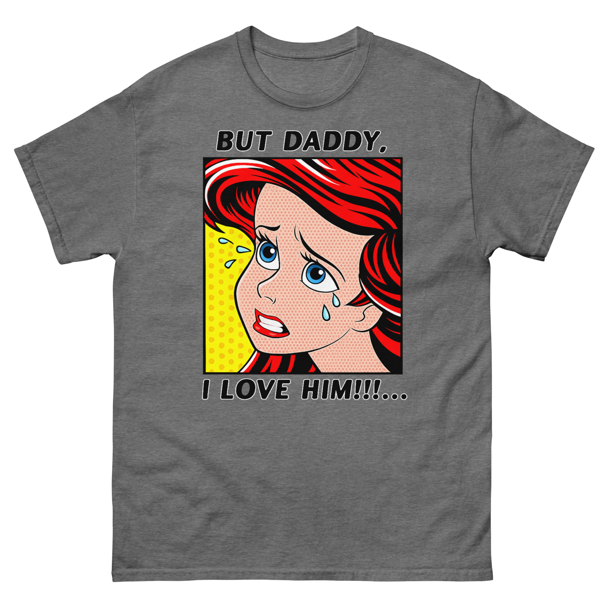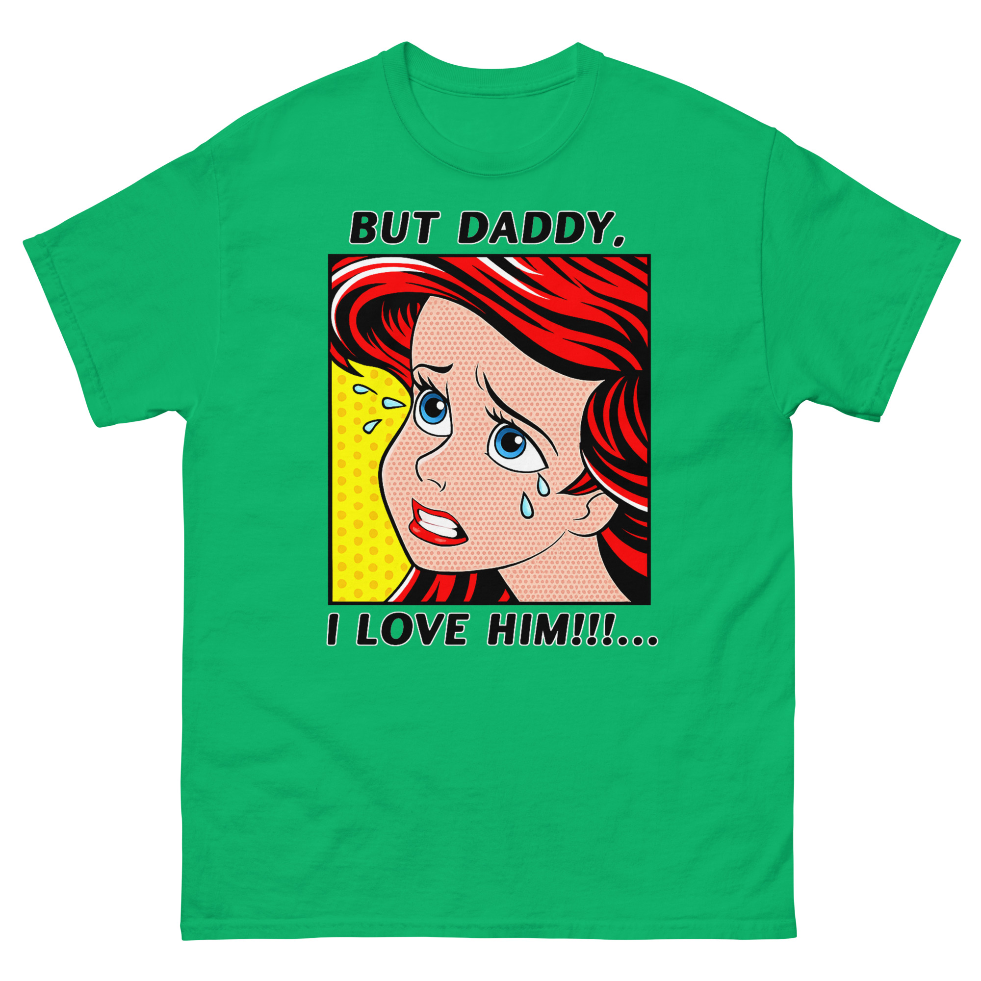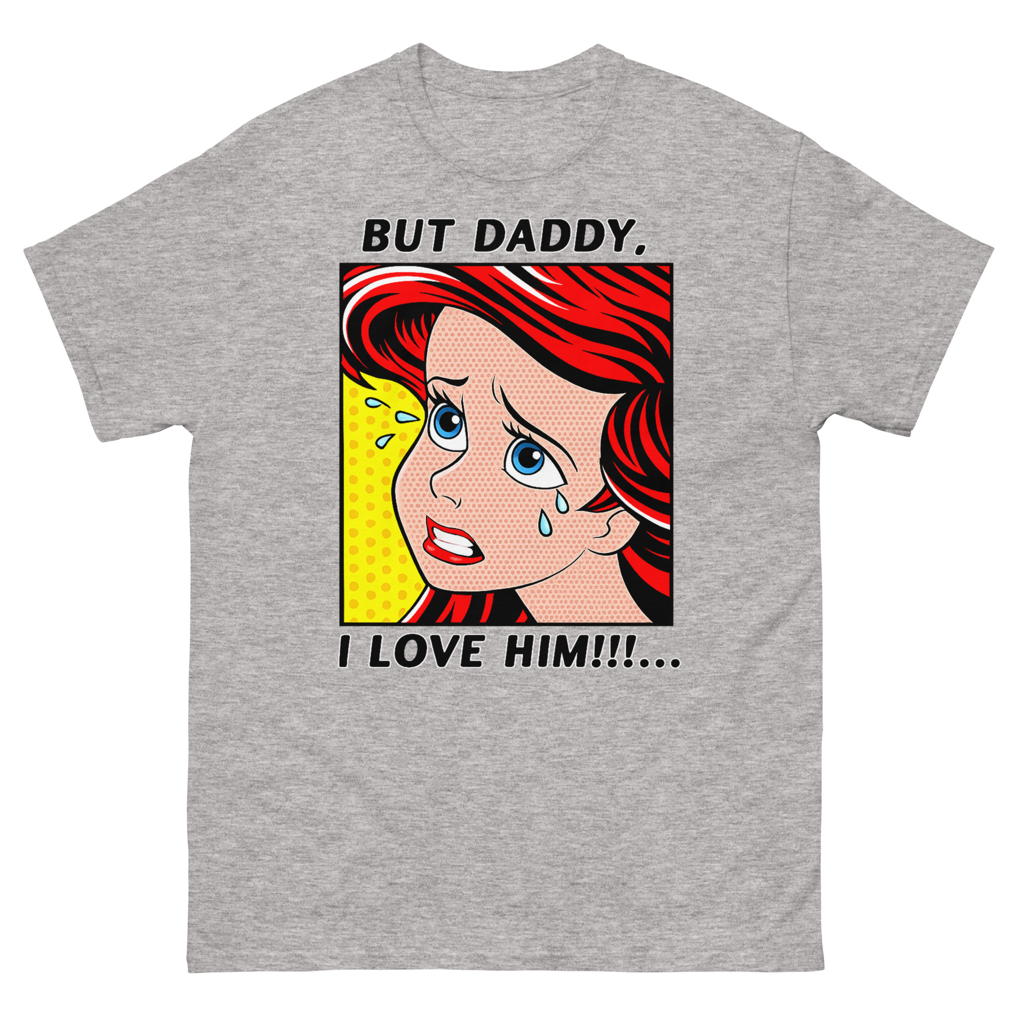 The result But Daddy I Love Him Shirt is this unique vintage comic book fan apparel. The vibrant red hair, blue tears, and classic yellow Ben-Day dot background capture that over-the-top, melodramatic feeling perfectly. It’s a nod to two different eras of art and music colliding. For example, it’s an ideal concert outfit idea for fans who want to show their style and sense of humor at a show. Similarly, it works as a fantastic gift for a melodramatic best friend or sister who appreciates a clever inside joke. You can style this statement piece with high-waisted jeans and sneakers for a casual look, or layer it under a denim jacket to let the comic panel peek through.