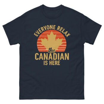 Show off your Canadian pride with this bold and humorous T-shirt. Featuring a retro maple leaf design with the slogan “Everyone Relax, the Canadian is Here,” this shirt is perfect for locals, expats, and anyone proud to represent Canada. A great gift for national holidays, travel, or everyday wear.