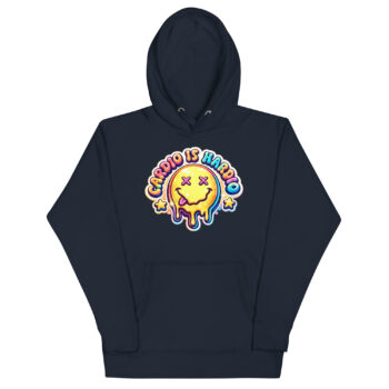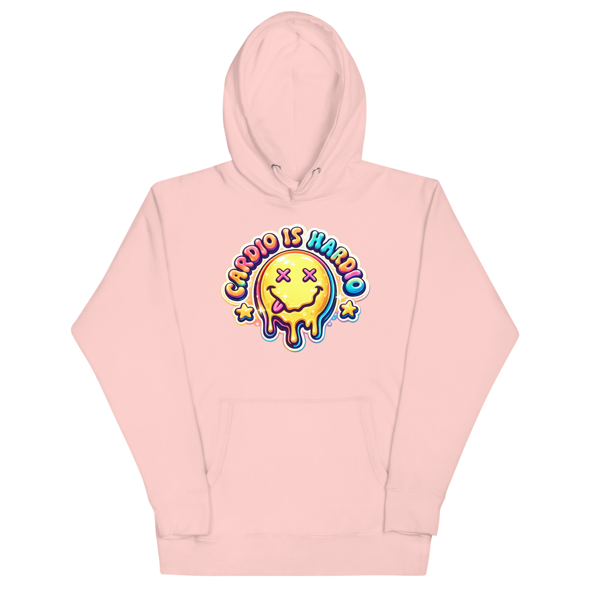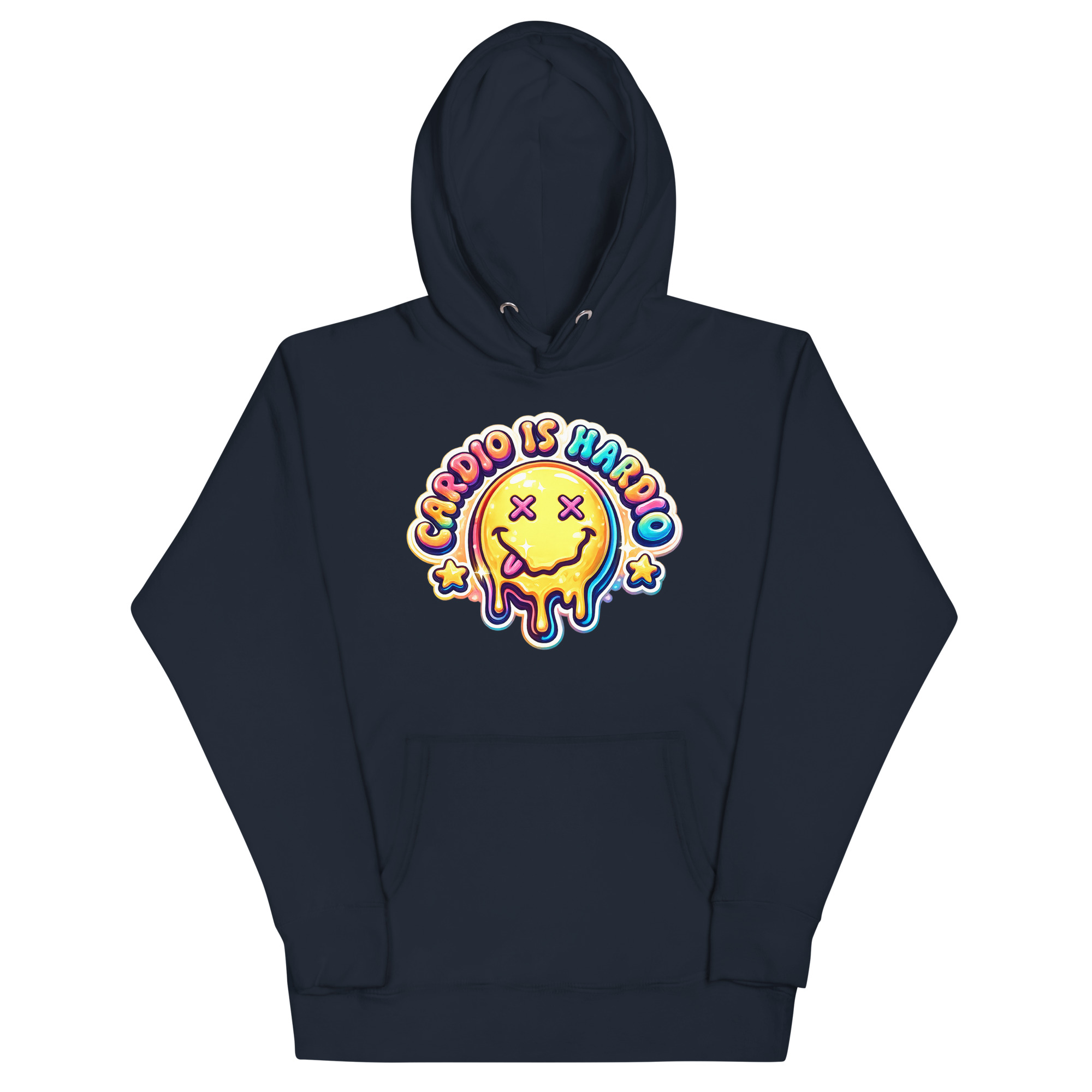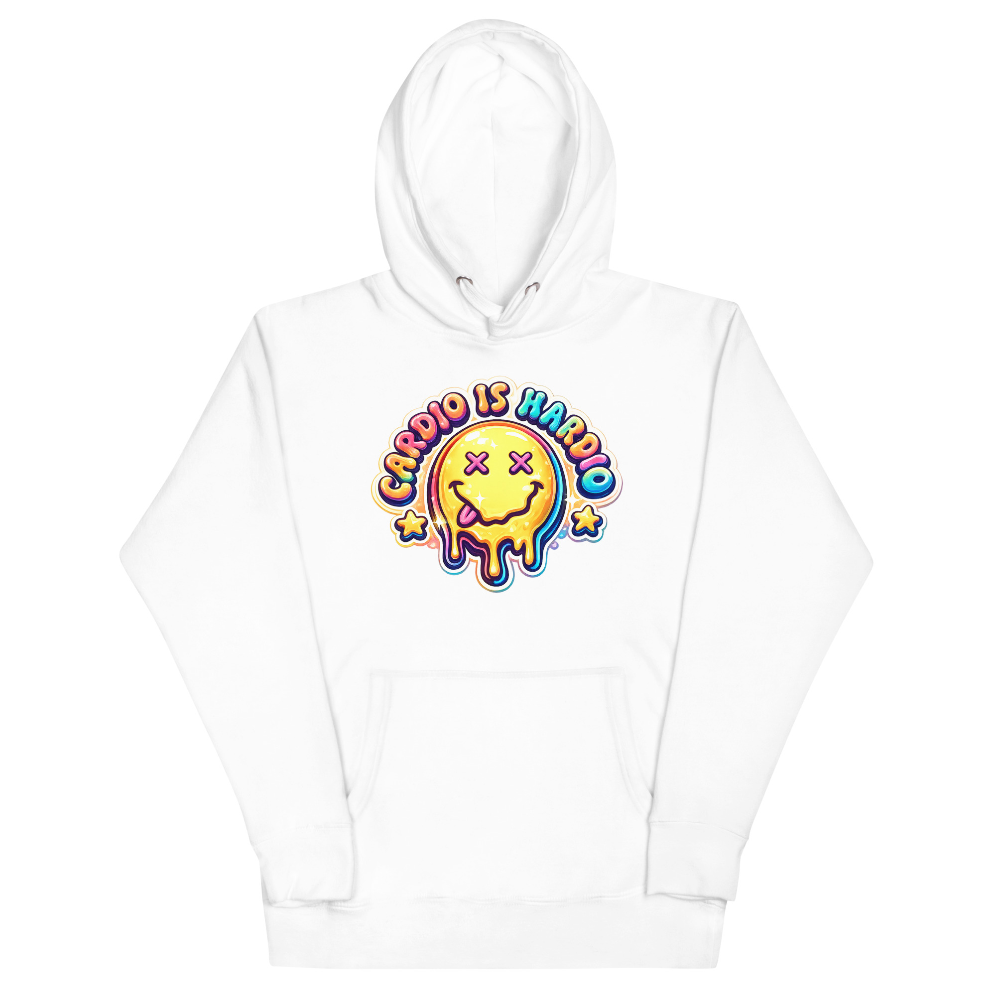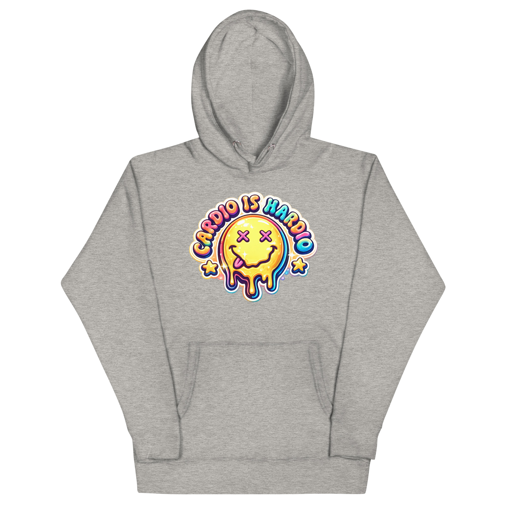 This design was inspired by those moments when your legs feel like jelly and your lungs are begging for mercy, but you keep going anyway. The melting smiley face with crossed-out eyes captures that “I survived cardio” feeling in a playful, relatable way. The phrase “CARDIO IS HARDIO” came straight from a post-workout joke between friends, now turned into a wearable badge of honor. Whether you’re hitting the treadmill or just love fitness-themed streetwear, this hoodie adds personality to your wardrobe.