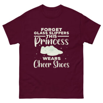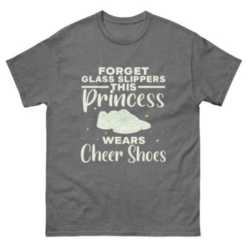 Your athlete trains like a princess—a powerful, athletic, unstoppable one. Now it’s time she dressed the part. Don’t settle for boring, basic practice wear. Upgrade her gear with the cheer practice shirt that matches her powerful spirit. Click ‘Add to Cart’ now to get this iconic “Forget Glass Slippers” tee. Let her wear her pride, empower her mindset, and own every practice session in the coolest cheer practice graphic tees on the market. After all, her crown is earned with every stunt, tumble, and victory!
