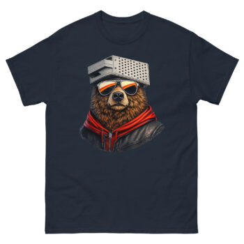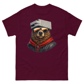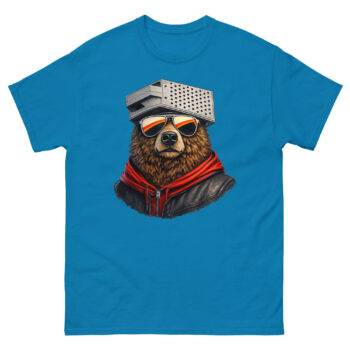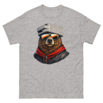 The Cheese Grater Bear Shirt is a short-sleeve graphic tee made from 100% cotton, featuring a surreal bear illustration that blends street fashion with humor. This shirt stands out with its bold design, a bear in a red hoodie, black leather jacket, and reflective sunglasses, topped with a cheese grater hat. It’s designed for people who love quirky fashion, streetwear culture, and bold statement pieces.