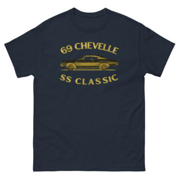 He chose a bold, yellow silhouette on a solid black canvas. This high-contrast style immediately grabs your eye, much like the car would on a sunny day at the racetrack. Similarly, the vintage-style typography shouts “69 CHEVELLE SS CLASSIC” with a confident, retro flair. Ultimately, this vintage Chevy Chevelle SS tee for men isn’t just a picture; it’s a story you wear across your chest.