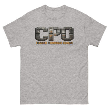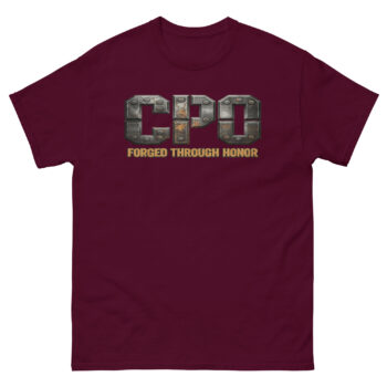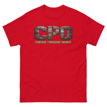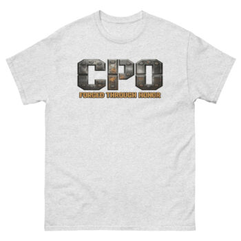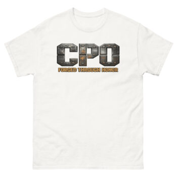 Honor the distinguished rank and dedication of a U.S. Navy Chief Petty Officer with this powerful “CPO Forged Through Honor” t-shirt. Featuring bold, metallic-textured CPO initials above the inspiring “FORGED THROUGH HONOR” motto, this shirt is a proud declaration of commitment and leadership.