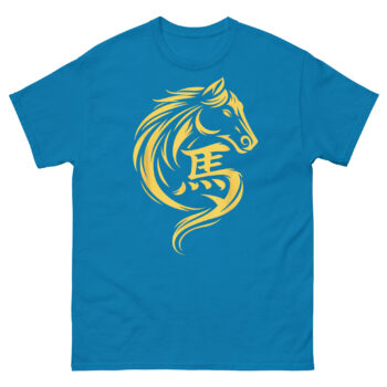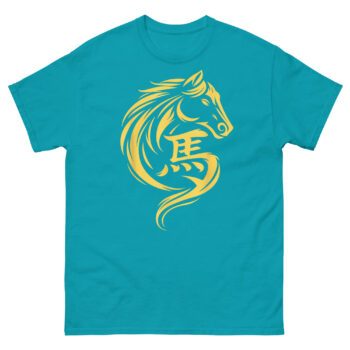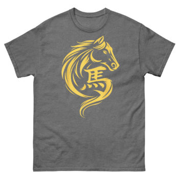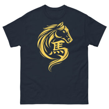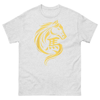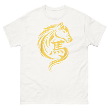 This is a sophisticated, minimalist graphic tee that blends ancient calligraphy with modern design. The Chinese New Year Horse T Shirt features a striking gold horse whose mane and form flow seamlessly into the Chinese character for horse (馬). It’s the perfect Chinese Zodiac apparel for those who appreciate clean lines, cultural depth, and a touch of metallic prosperity.