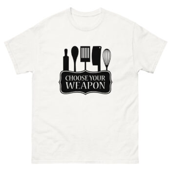 This choose your weapon cooking shirt isn’t just apparel – it’s a battle cry for anyone who takes their cooking seriously (but not themselves).