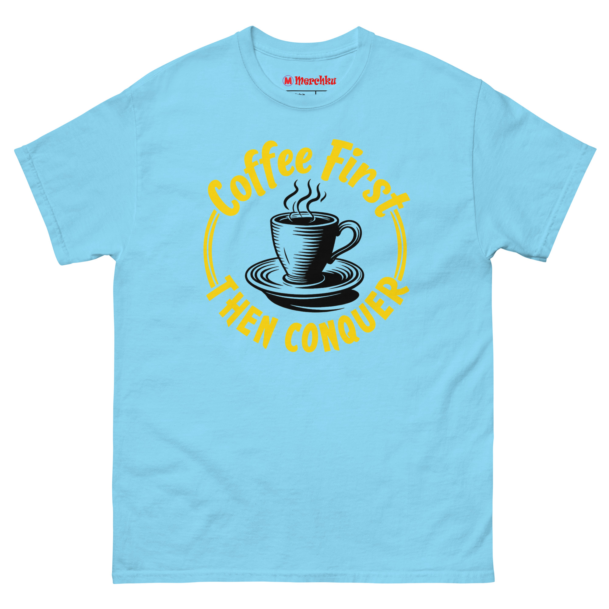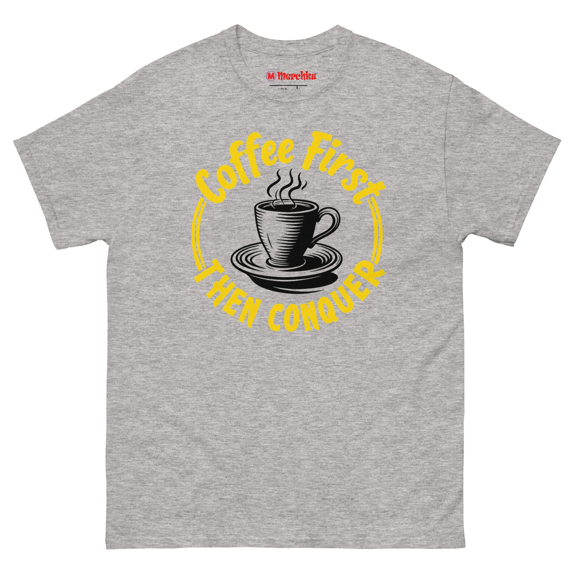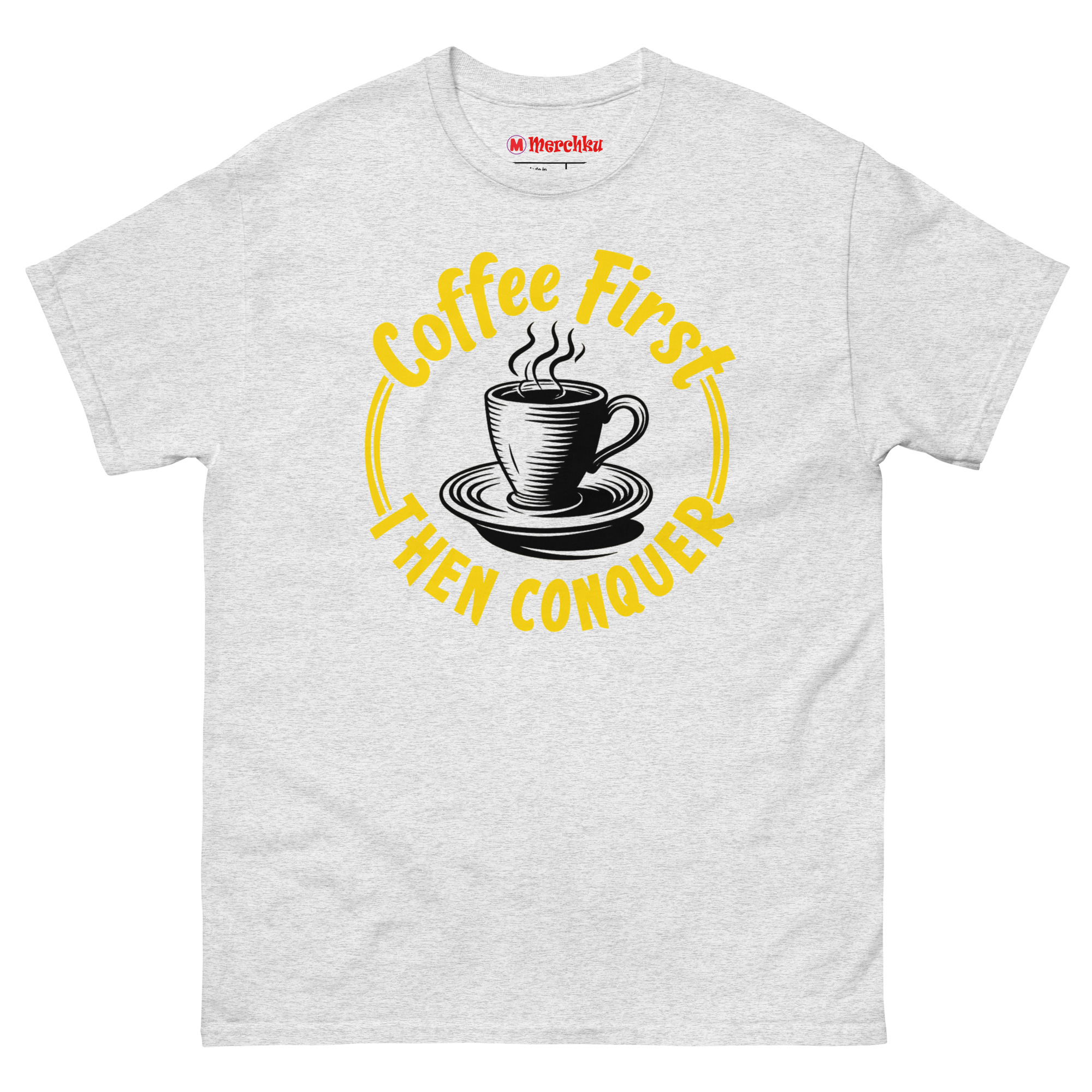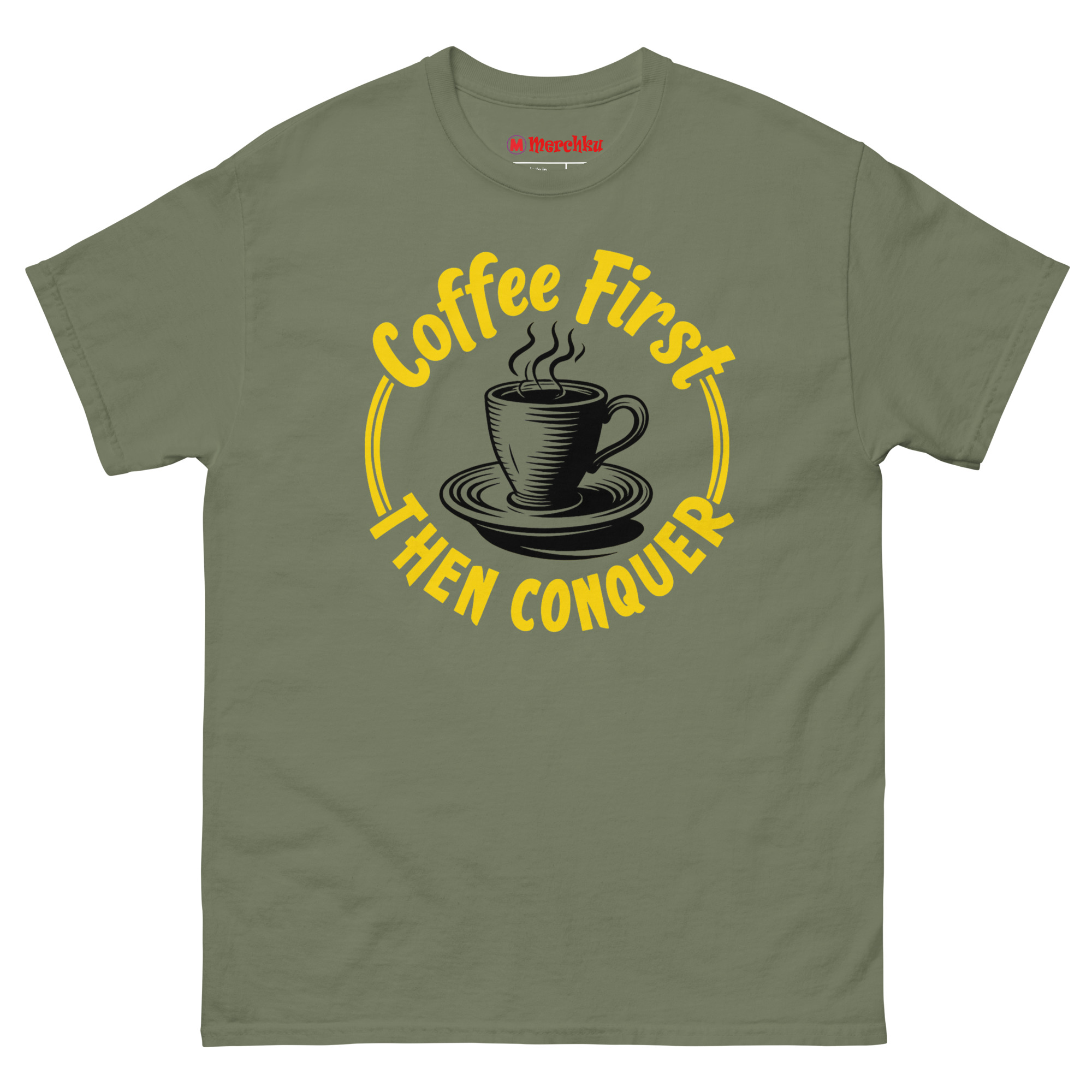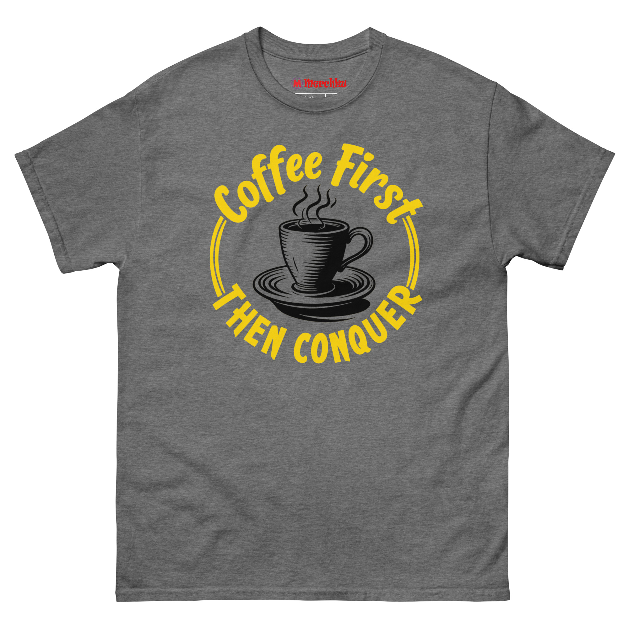 Ready to Fuel Your Morning Conquest? Grab Your Coffee First Then Conquer T Shirt Today