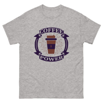The deep purple banners (“COFFEE” at the top, “POWER” at the bottom) create a high-contrast, eye-catching look. Whether you’re at a café or a casual meetup, this cute coffee shirt turns heads.