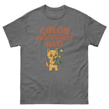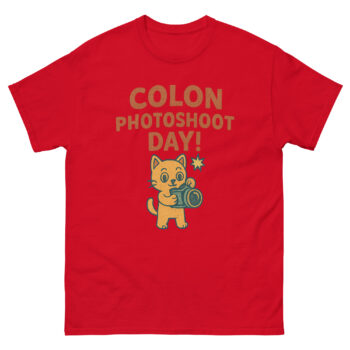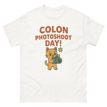 Above our determined feline friend, bold, declarative text announces “COLON PHOTOSHOOT DAY!” This combination of visual and textual gag creates an instant classic. It’s the ultimate conversation starter, perfectly walking the line between cheeky and charming. Whether you’re the patient braving the prep or a gastroenterologist who appreciates a good gag gift, this shirt speaks your language.