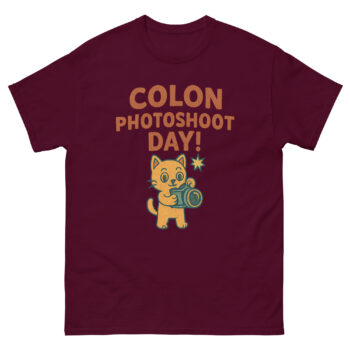 This burgundy shirt features the hilarious phrase “Colon Photoshoot Day!” with a cartoon cat holding a camera, ready for action. It’s a clever medical humor tee that makes light of colonoscopy day while raising awareness. Perfect for patients, doctors, nurses, GI specialists, or anyone with a sense of humor about health.