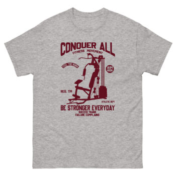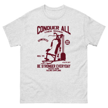 Step into the gym ready to dominate with the Conquer All – Be Stronger Everyday t-shirt. Featuring a detailed maroon home gym machine graphic and empowering phrases like “Aim High,” “Feel the Burn,” and “Success Trains, Failure Complains,” this shirt inspires relentless progress.