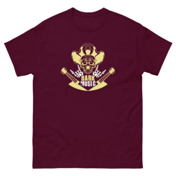 Ride into the dark side of music with this cowboy skull t-shirt. Featuring a flaming hat, crossed guitars, and “Dark Music” lettering, it’s the perfect match for metalheads, outlaw rockers, and fans of gothic western vibes.
