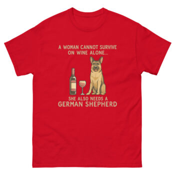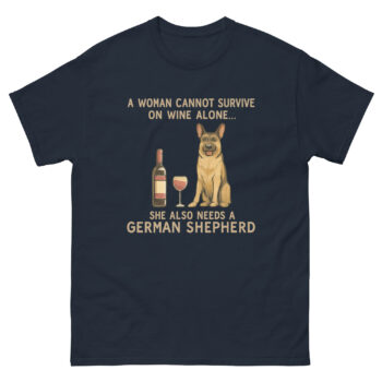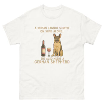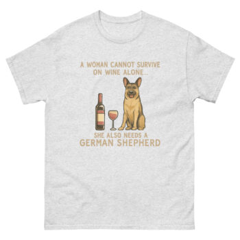 The phrase on the shirt starts with a playful twist on a well-known saying: “A WOMAN CANNOT SURVIVE ON WINE ALONE…” This line immediately brings a smile because it’s relatable. After a long day, a moment to unwind is essential. However, the second line reveals the real secret: “SHE ALSO NEEDS A GERMAN SHEPHERD.”