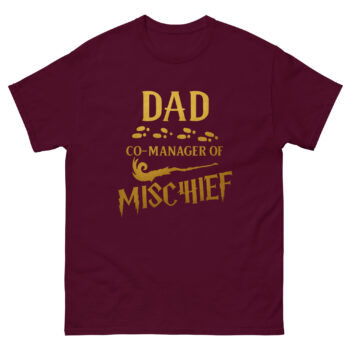 A Design with Intent: The bold, gold-colored statement “DAD CO-MANAGER OF MISCHIEF” immediately commands attention. Playful footprints trail between the lines, symbolizing those little partners in crime. Most importantly, a elegant wand points the way to the next adventure, while the jagged, fantasy-font “MISCHIEF” adds that essential spellbound vibe. This is undoubtedly a dad fantasy magic shirt that tells a story.