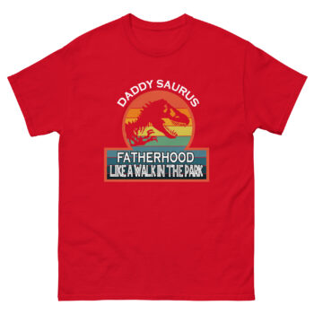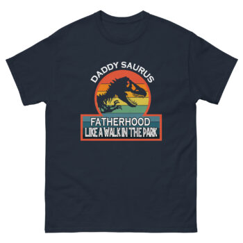This “Daddysaurus” T-shirt features a bold retro sunset backdrop with a roaring T-Rex silhouette and the playful phrase: “Fatherhood – Like a Walk in the Park.” The design blends humor and nostalgia, inspired by classic dinosaur movies.