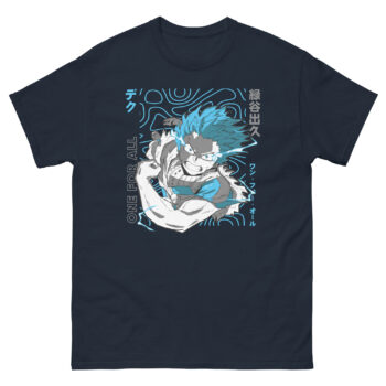 Imagine this: Izuku Midoriya, frozen in a dynamic leap. Electric blue energy crackles around him, highlighting his unwavering resolve. Moreover, bold text runs down the side, declaring the legacy he carries: “ONE FOR ALL.” Meanwhile, his name in Japanese, デク (Deku) and 緑谷出久 (Izuku Midoriya), anchors the design in authentic character lore. This powerful central image is set against a black canvas with abstract blue lines radiating outwards, creating a stunning sense of speed and impact. Ultimately, this Deku Full Cowl t-shirt is a masterpiece of motion and emotion.