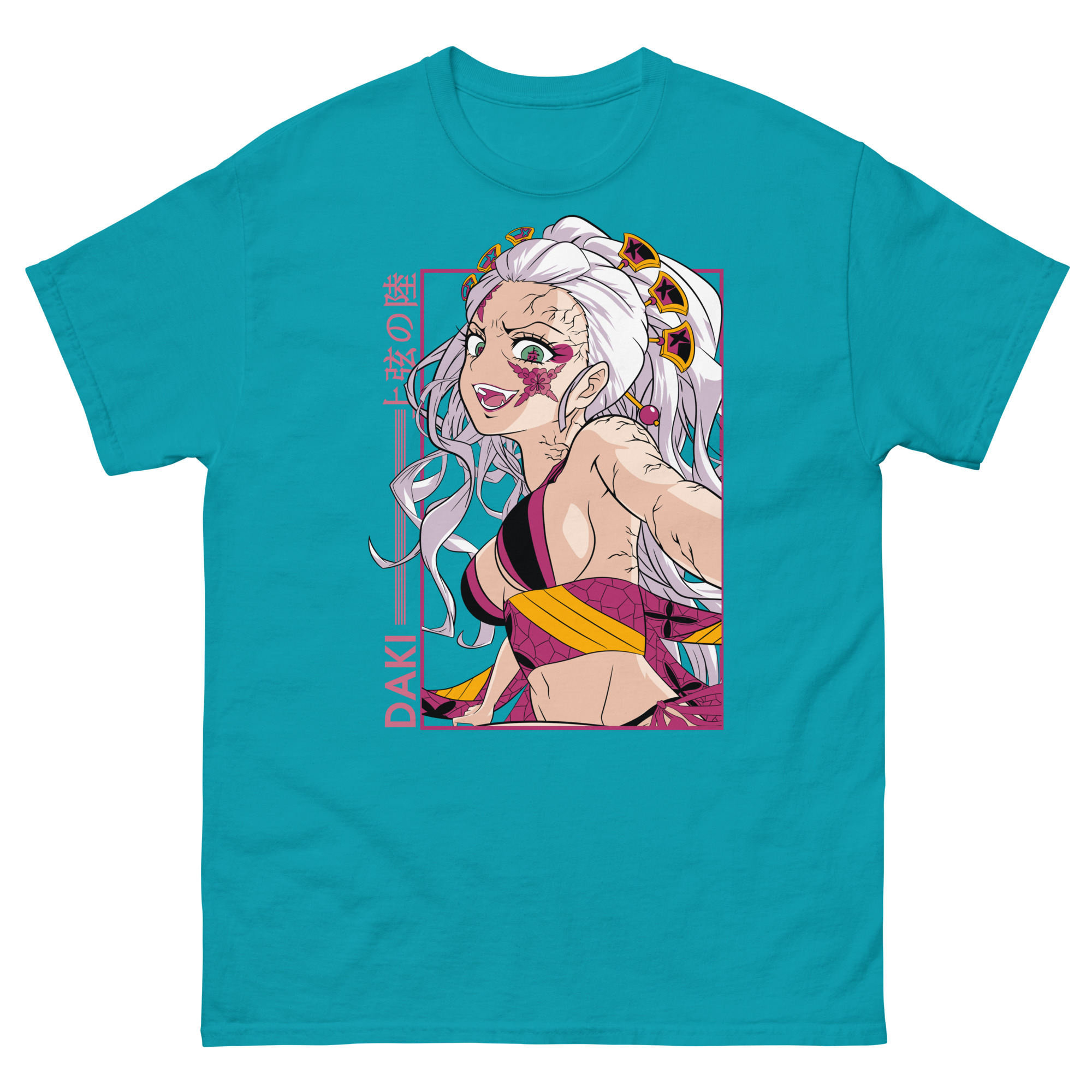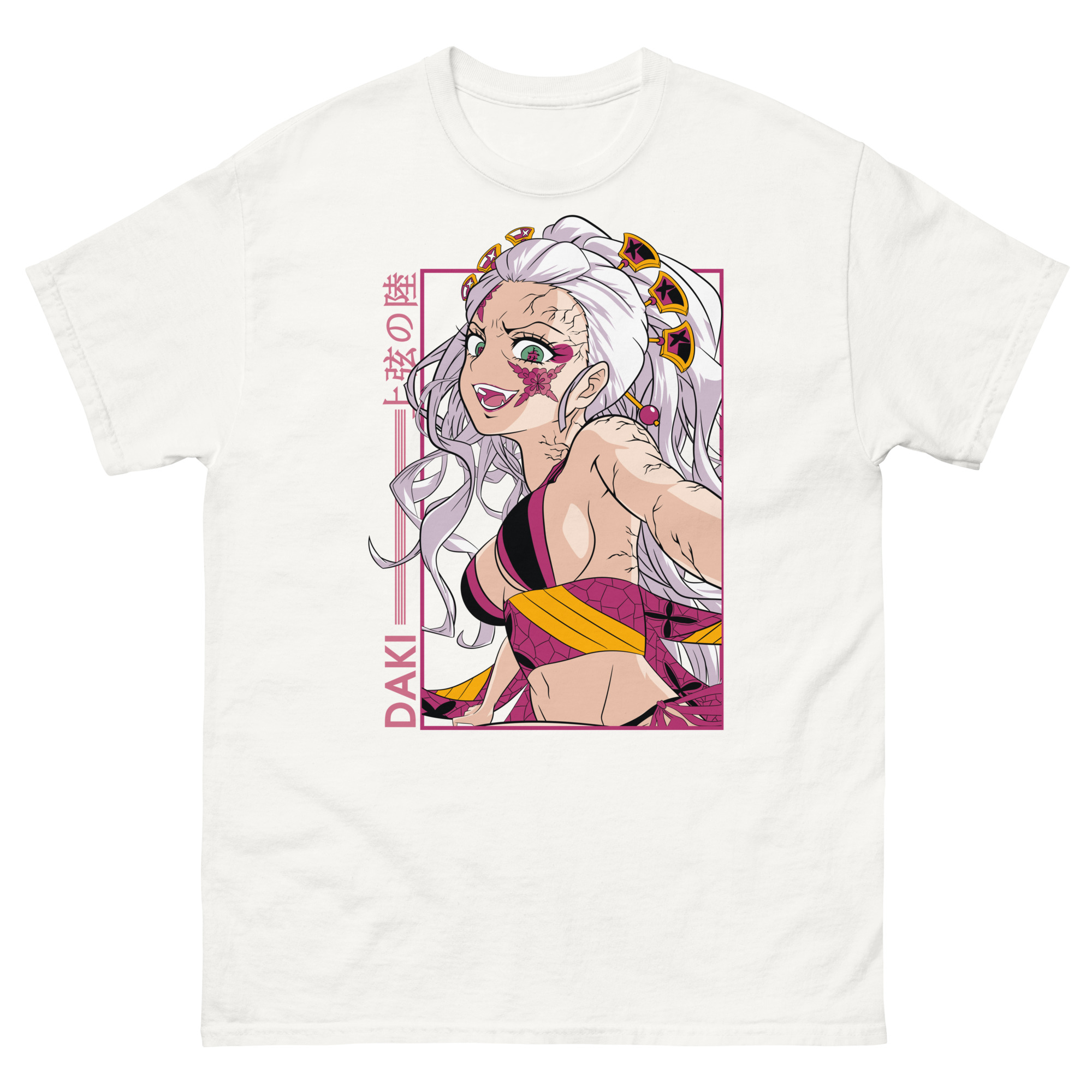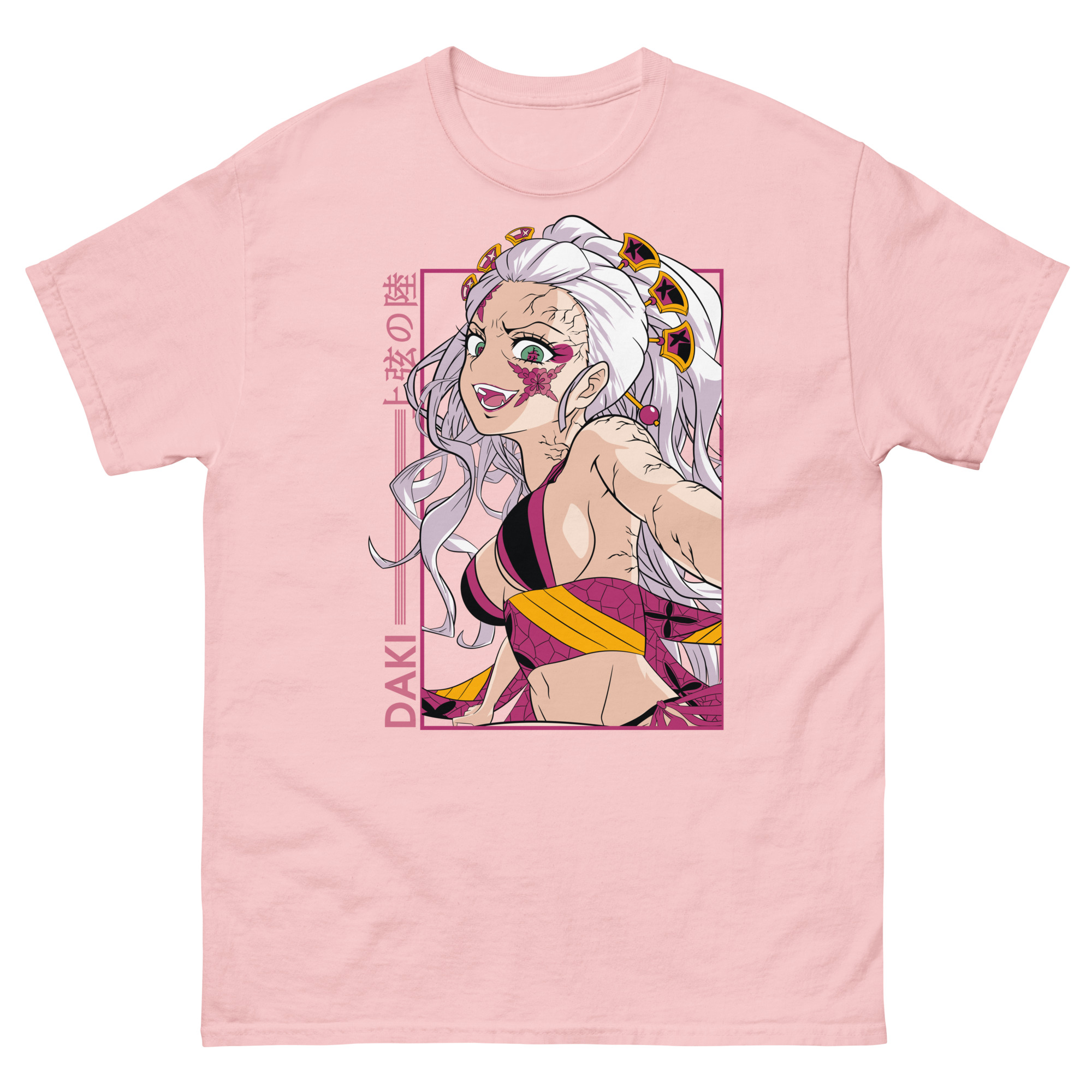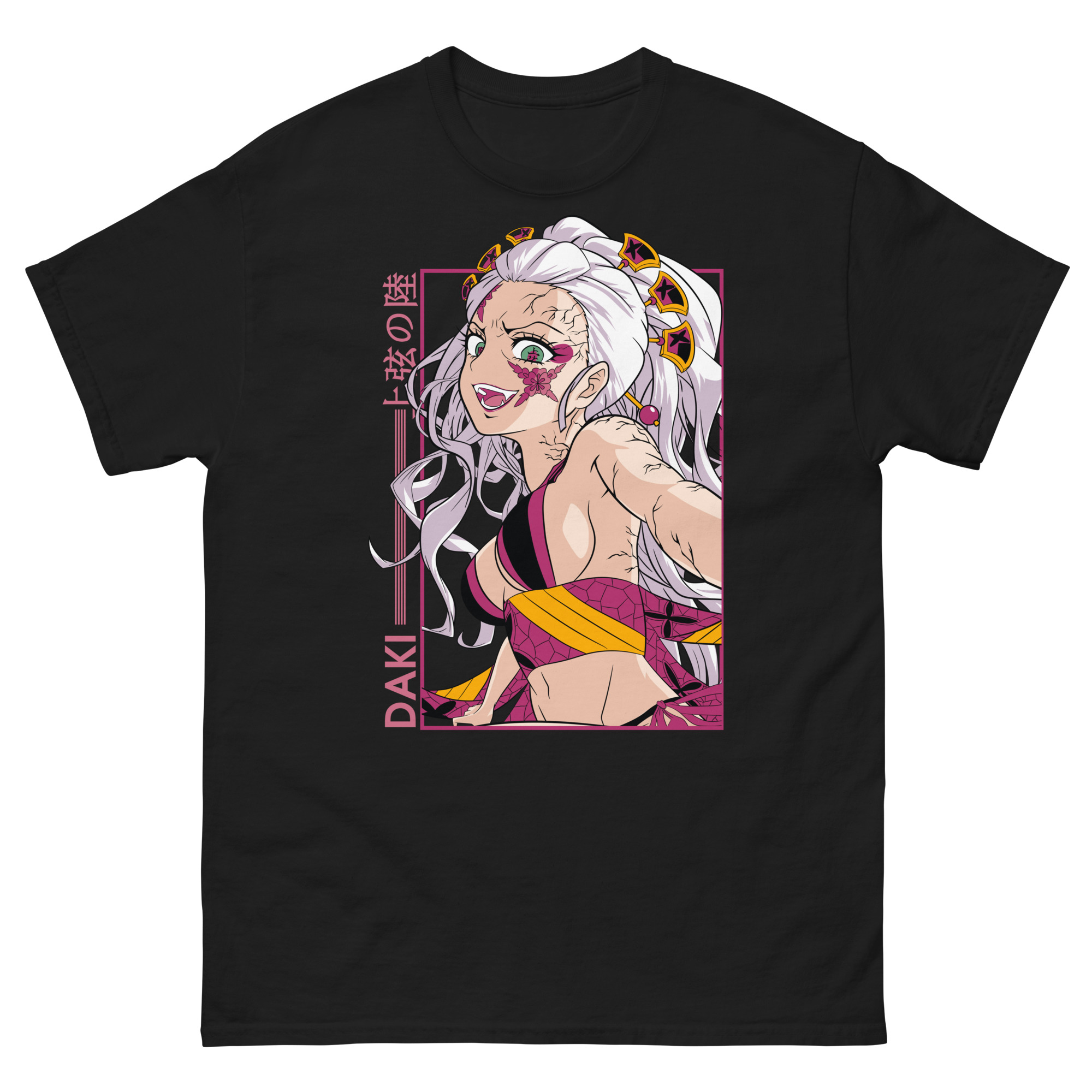 Let’s explore the visual story this graphic tee tells. The central portrait showcases Daki in her full, elegant regalia, her expression perfectly balancing seduction and menace. Authentic Japanese Kanji, “上弦の陸” (Upper Rank Six) proudly crowns the design, a badge of her high status. The bold, vertical “DAKI” text adds a modern, striking edge. Importantly, the pink framing does more than decorate; it creates a sense of sacred space, as if you’re viewing a shrine to this complex femme fatale. Every element, from the color clash to the symbolic framing, reflects the internal conflict that makes her, and her brother Gyutaro, so compelling.