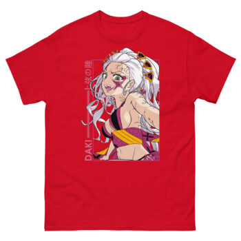 This Daki shirt is a statement piece for a specific kind of fan. Do you admire strong, intricate character design? If you love the Entertainment District Arc’s mix of luxury and darkness, this tee is for you.. Style it with a sleek black skirt or tailored pants for a concert look that commands attention. Alternatively, wear it with jeans for a casual day out, signaling your sophisticated taste in anime narratives. It’s for those who aren’t afraid to embrace the beauty in darkness and celebrate one of the most visually stunning demons in the series.