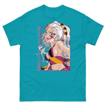 Our design team doesn’t just copy images; we translate character essence. When crafting this Upper Rank Six tee, we were captivated by Daki’s role as Warabihime (the Young Princess). How could we show her divine beauty and monstrous rage in one glance? The answer was in the details: the sharp contrast of neon pink against deep black, the piercing green of her eyes, and the graceful flow of her hair that mimics her deadly Blood Demon Art. We framed her like a masterpiece in a gallery, because that’s what she is a tragic, terrifying work of art. This shirt is our tribute to her unforgettable legacy.